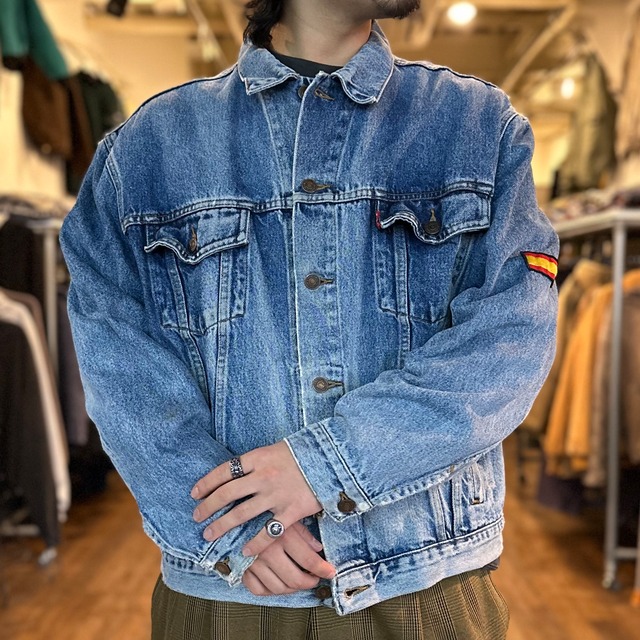 【一点物】90s LEVI’S 70503-0210 Denim Jacket リーバイスからデニムジャケットのご紹介。 ポケットの付くタイプ◎ さらにカスタムワッペン付きの一点物ジャケット‼︎ XLサイズで多くの方に着用して頂けます◎ インナーにスウェットを持ってきても良きです‼︎ 色落ちもカッコよく雰囲気抜群 是非お早めにどうぞ。 SIZE【XL】 肩幅 約54㎝ 身幅 約66.5㎝ 袖丈 約62㎝ 着丈 約61㎝ 【コンディション】 右脇、黄染みあり ※ 当店の取り扱い商品の殆どがビンテージ古着になりますので明らかな計測ミスや着用に支障が出るレベルの大きなダメージ(アジとして捉えるには難しいレベル)の記載忘れ等が無い限りは返品、交換は受け付けておりません。