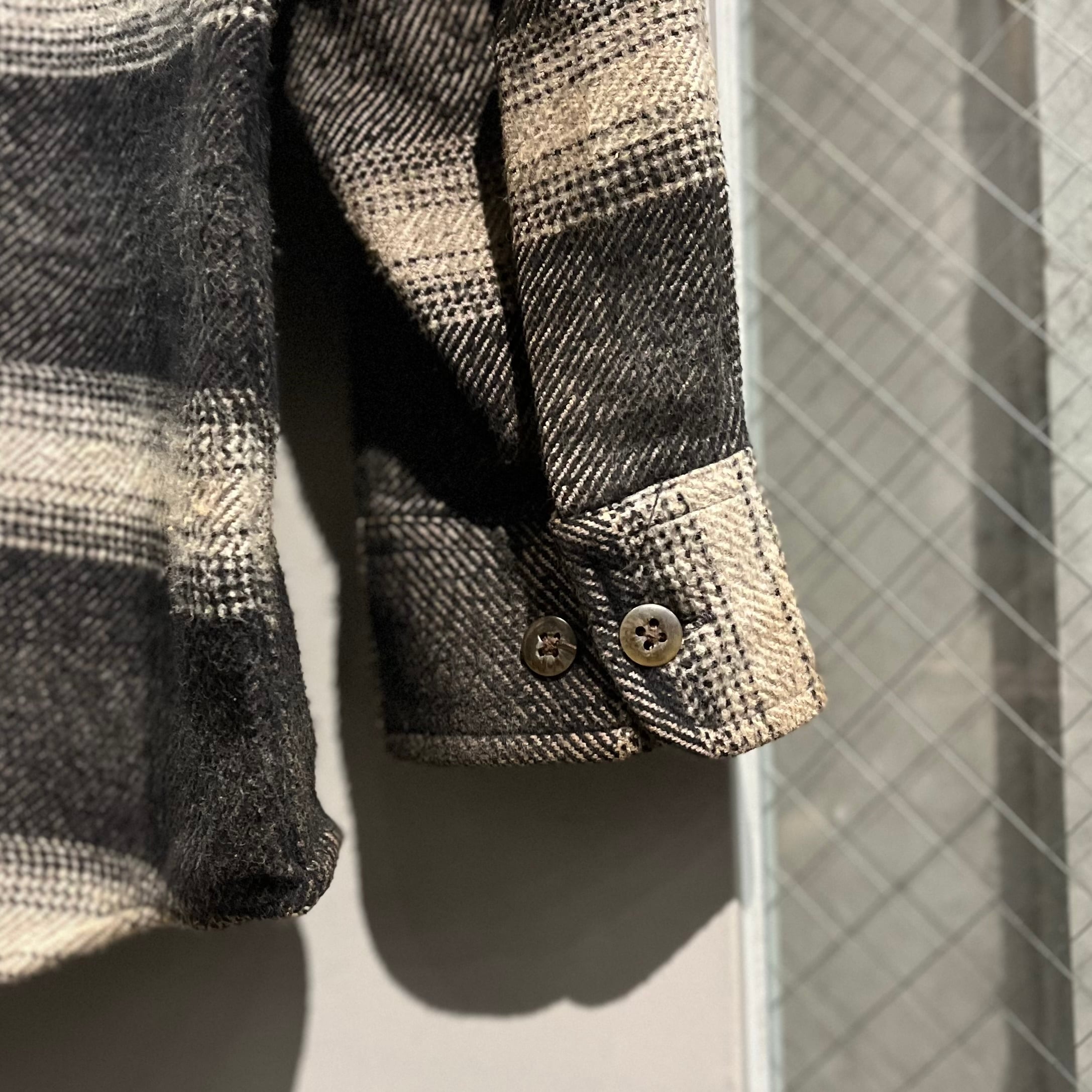 かなり太い番手の糸を使っており、ベージュボディの上からツイードのようにダークトーンの織りが掛けられた結果このような重たさとごま塩のような色合いになっていると考えられます