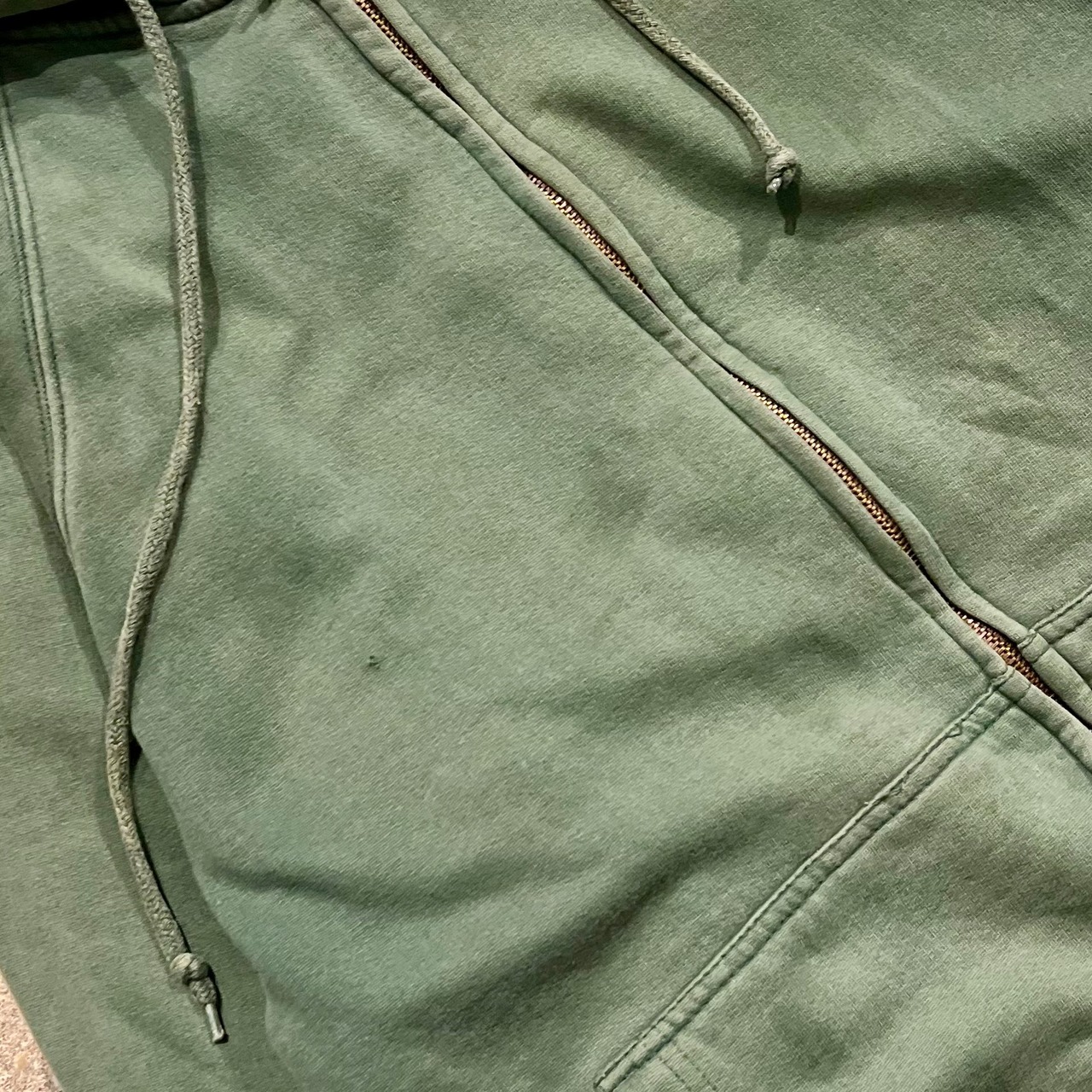 ヴィンテージライクなグリーンフェードが目を惹くこちらのジップアップフーディー