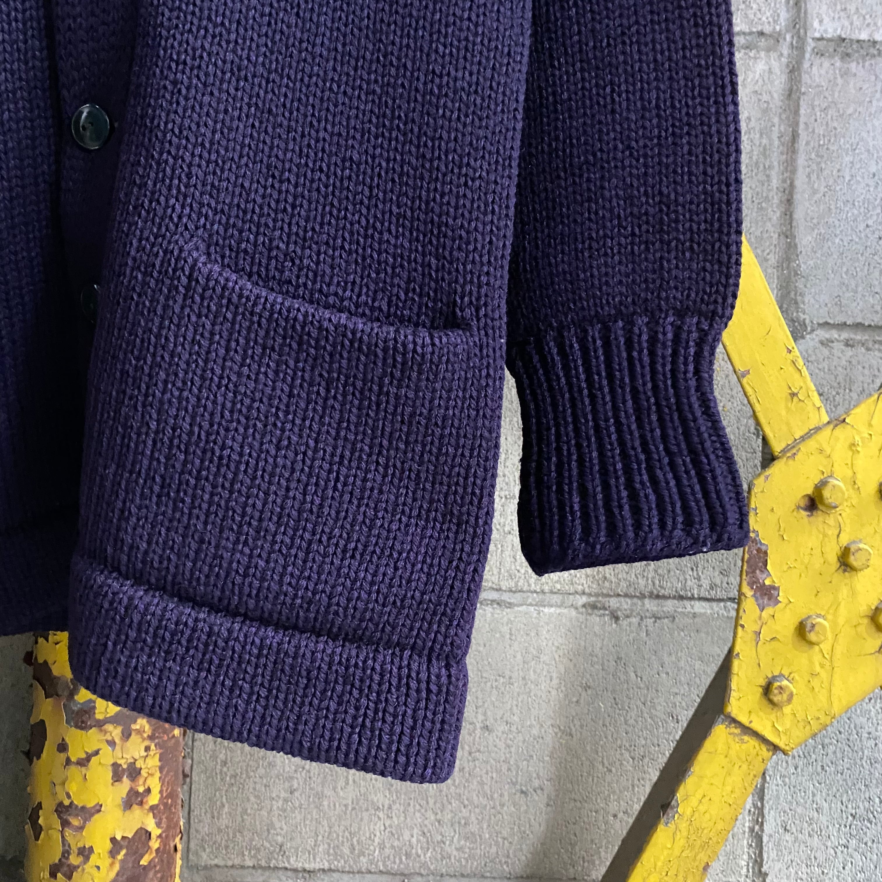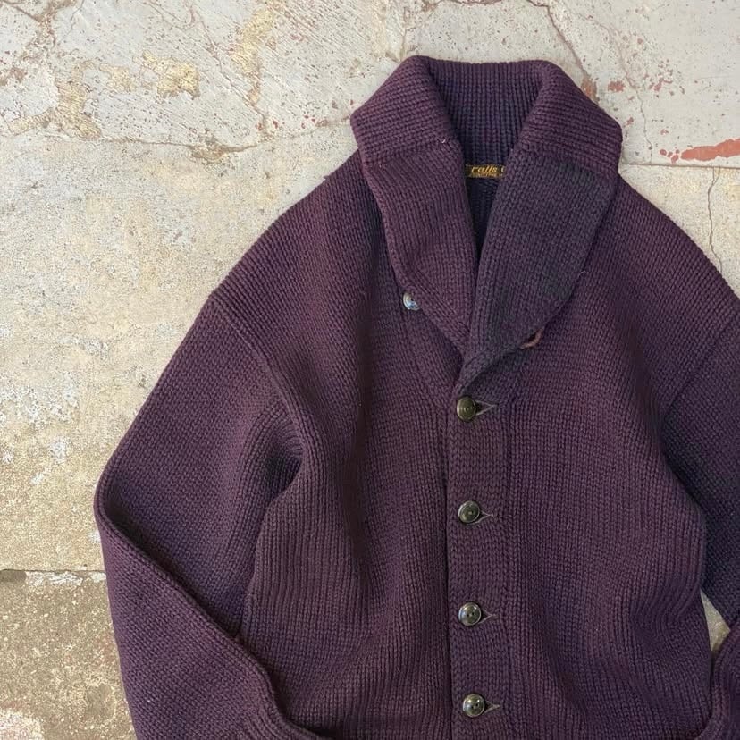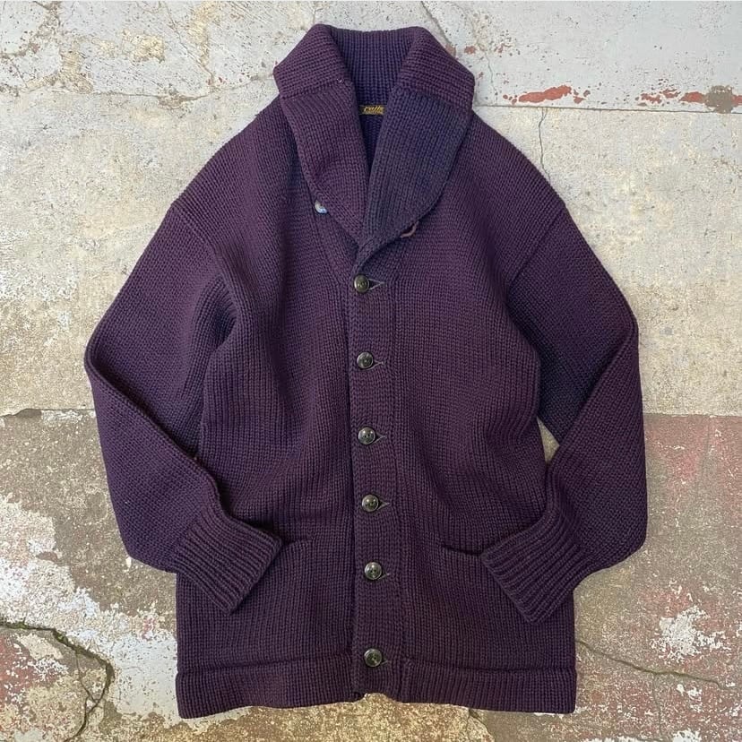 ショールカラーのニットカーディガンといえば、ネイビーやグレー系がほとんどのイメージだったのでこのような雰囲気の個体は珍しいですね。