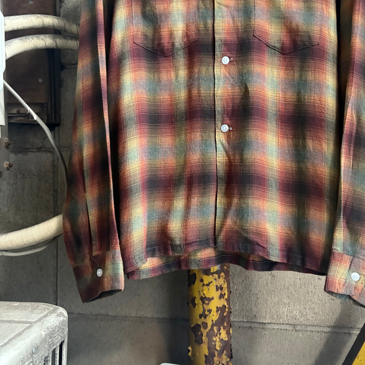 いかにも70'sな細長い襟、オンブレチェックの好配色です。