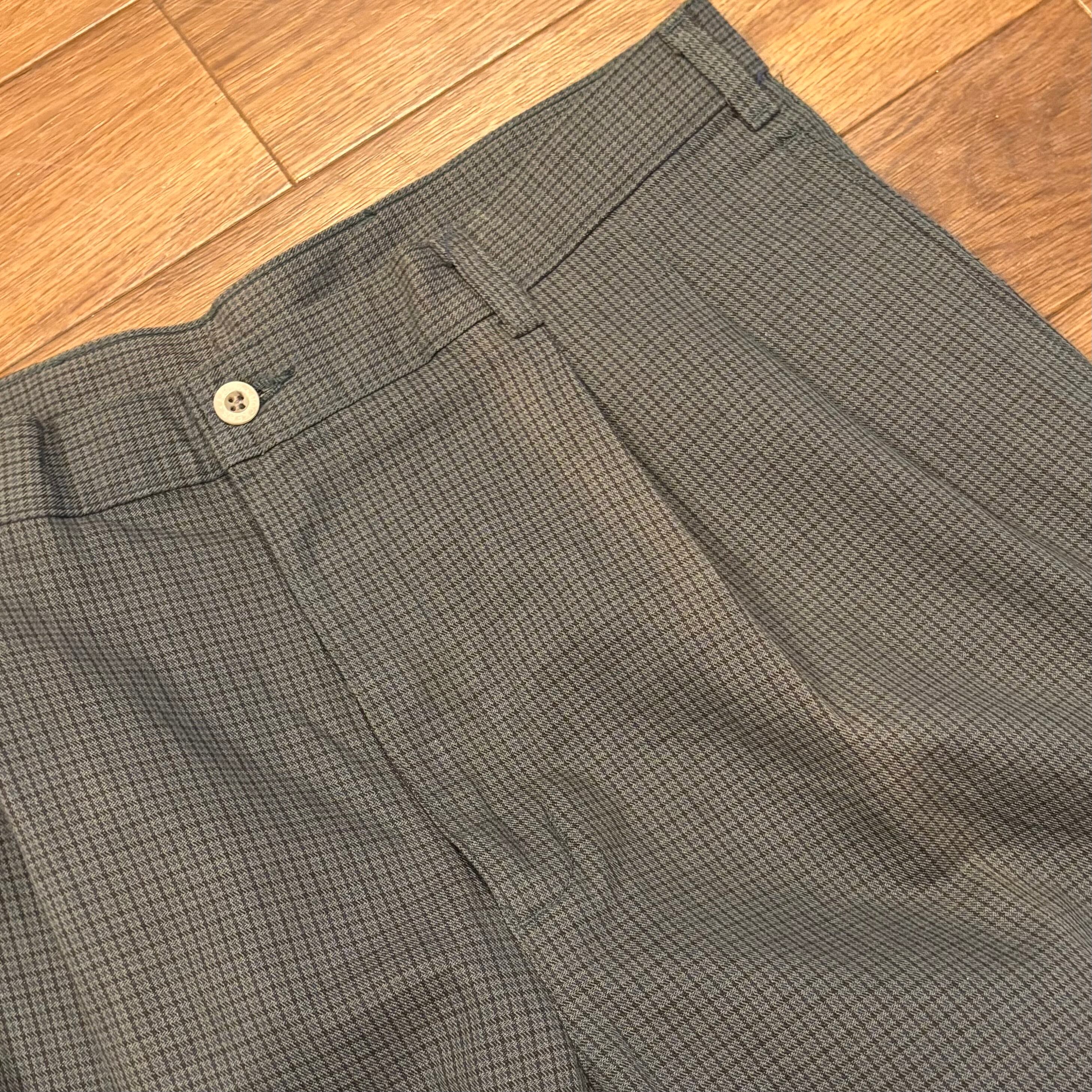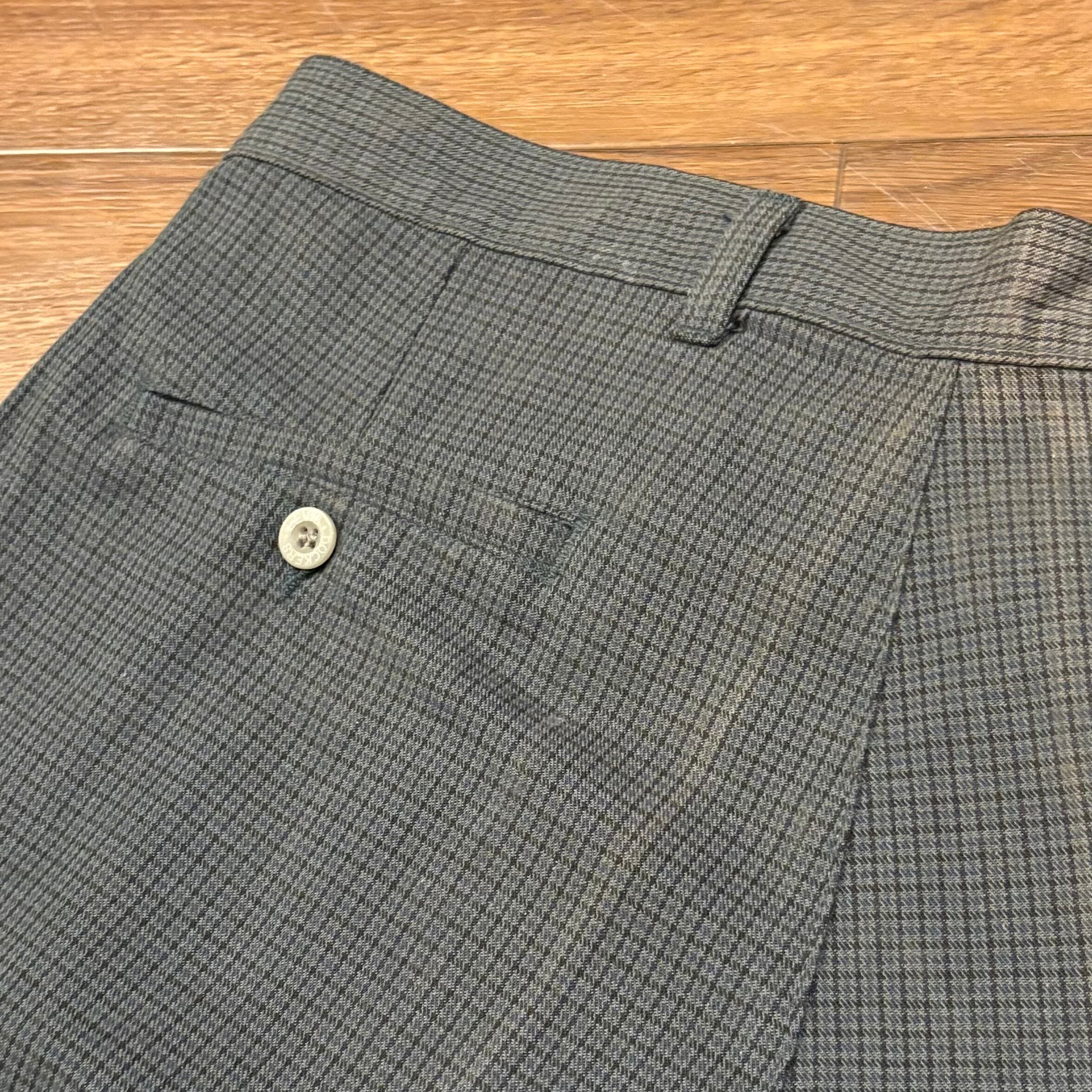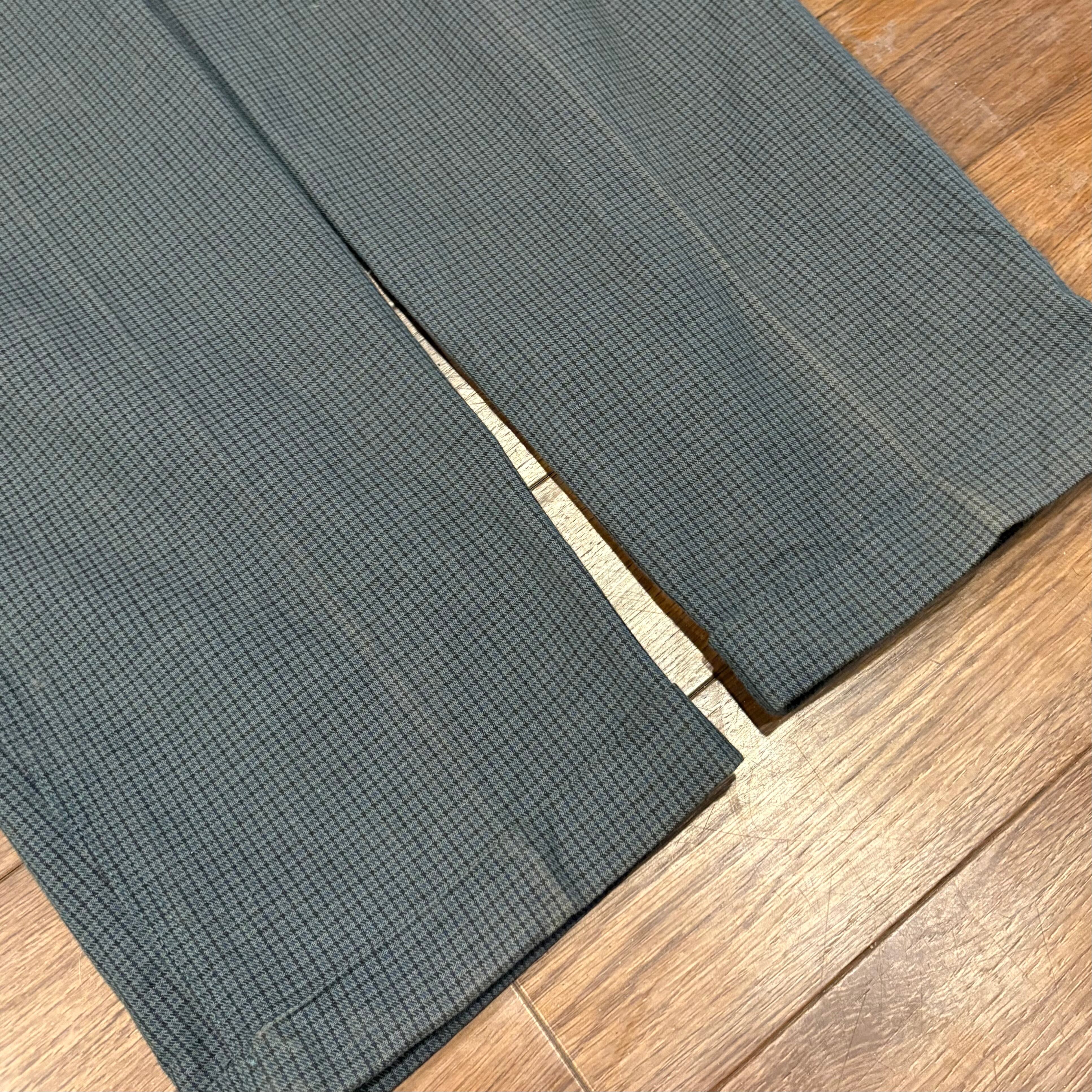 グレーとグリーンを合わせた様なマットカラーにブルー、ブラックの千鳥格子が入る、洒落パンツ。