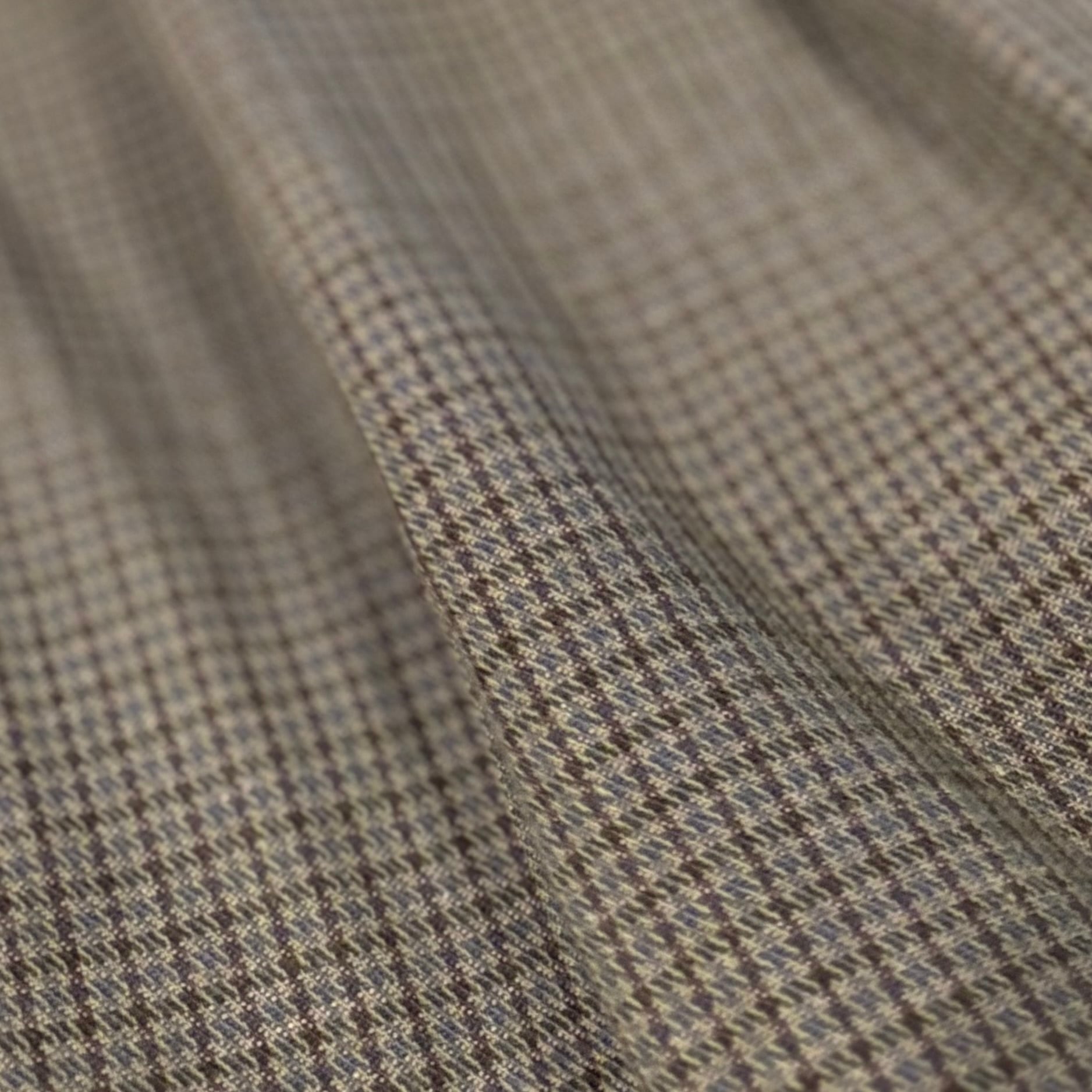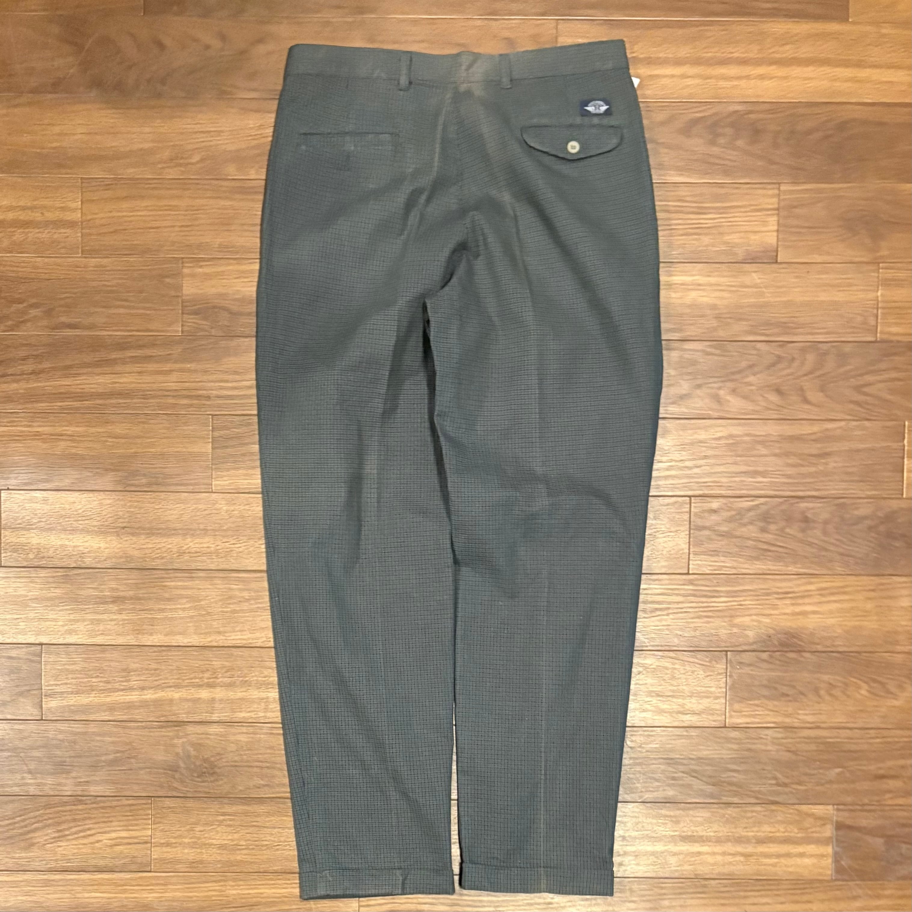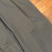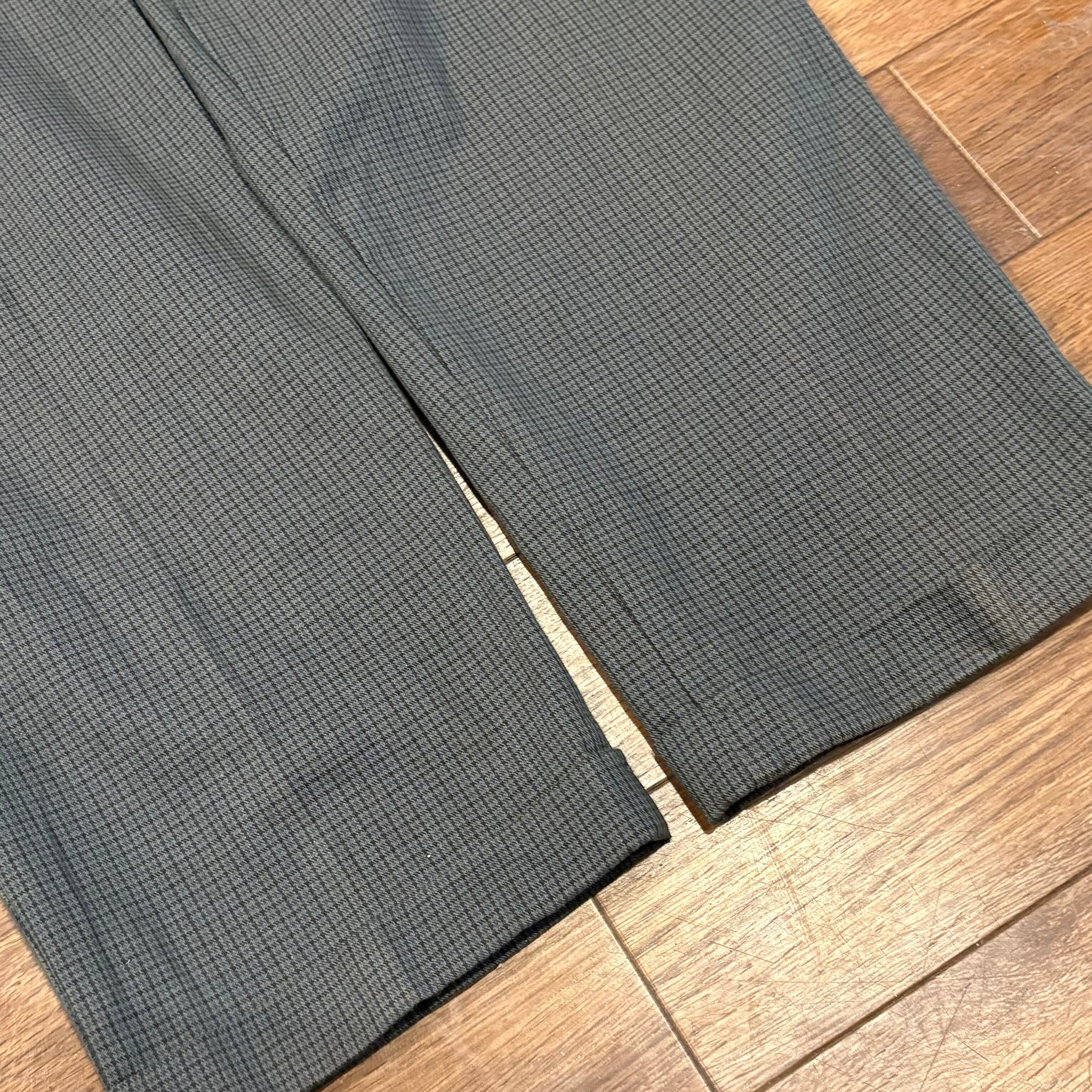 グレーとグリーンを合わせた様なマットカラーにブルー、ブラックの千鳥格子が入る、洒落パンツ。