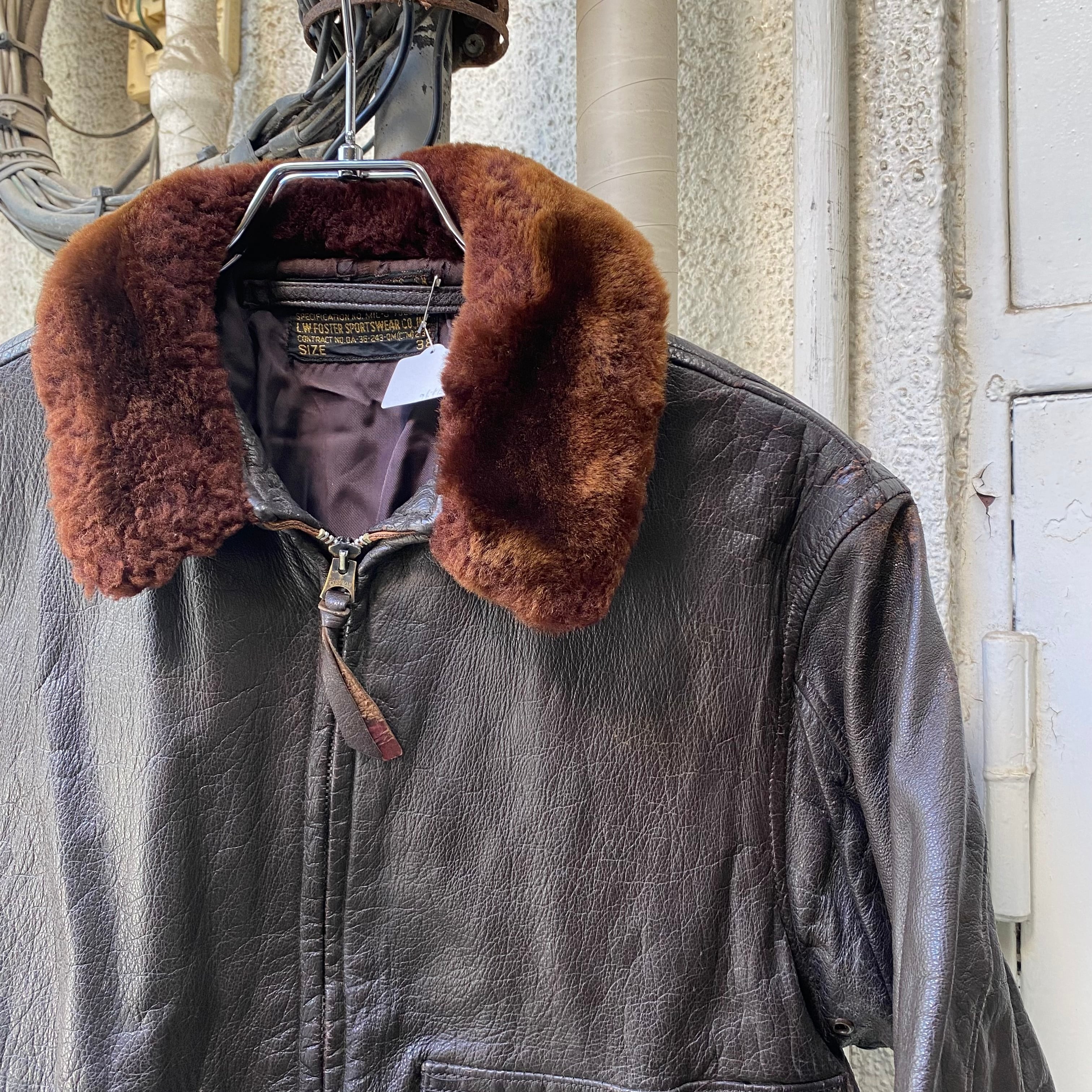 屈強なゴートスキンを使った1着でとてもタフなレザージャケット。比翼にはUSNのパンチングが入ります。タイトフィットなシルエットでビシッときまる1着です。
