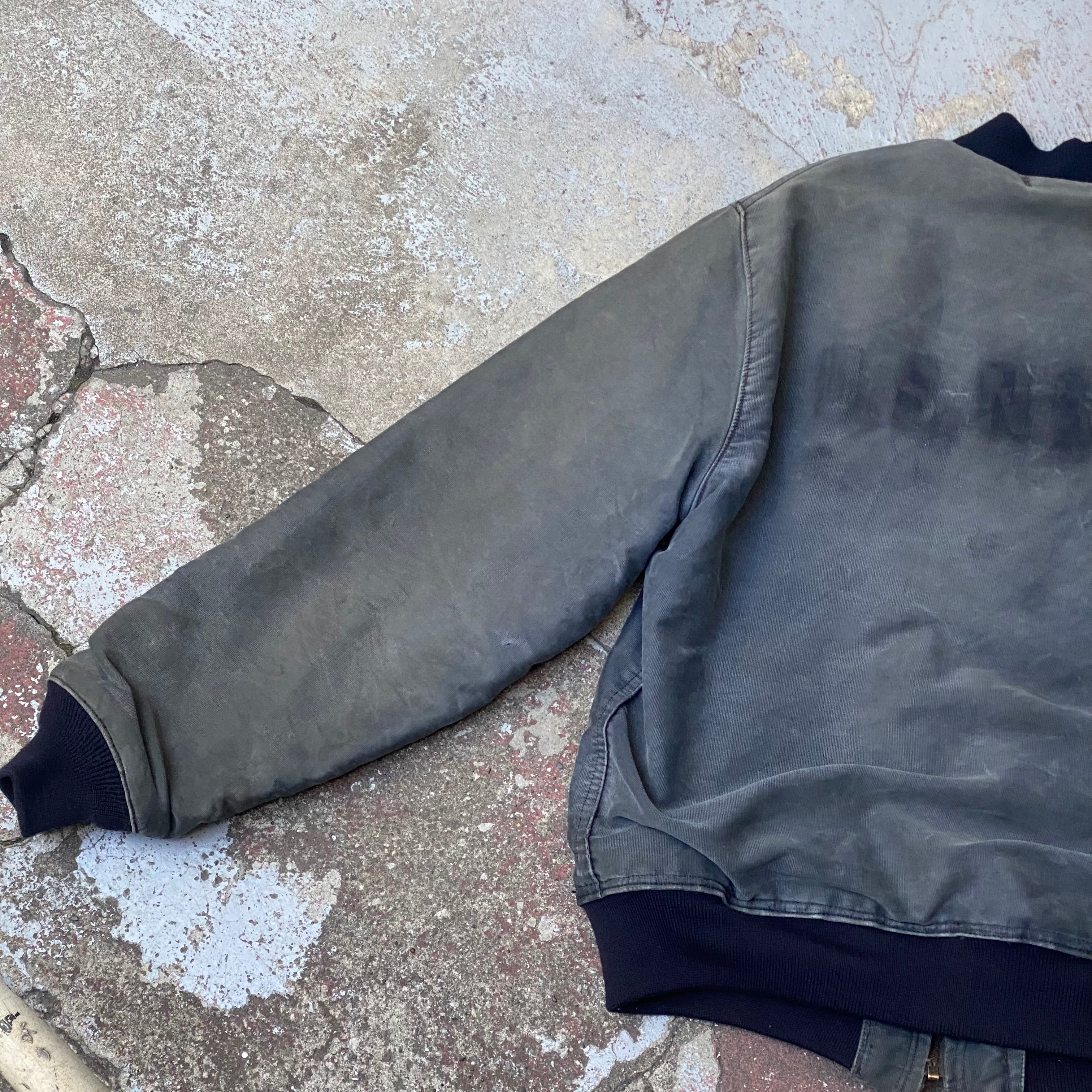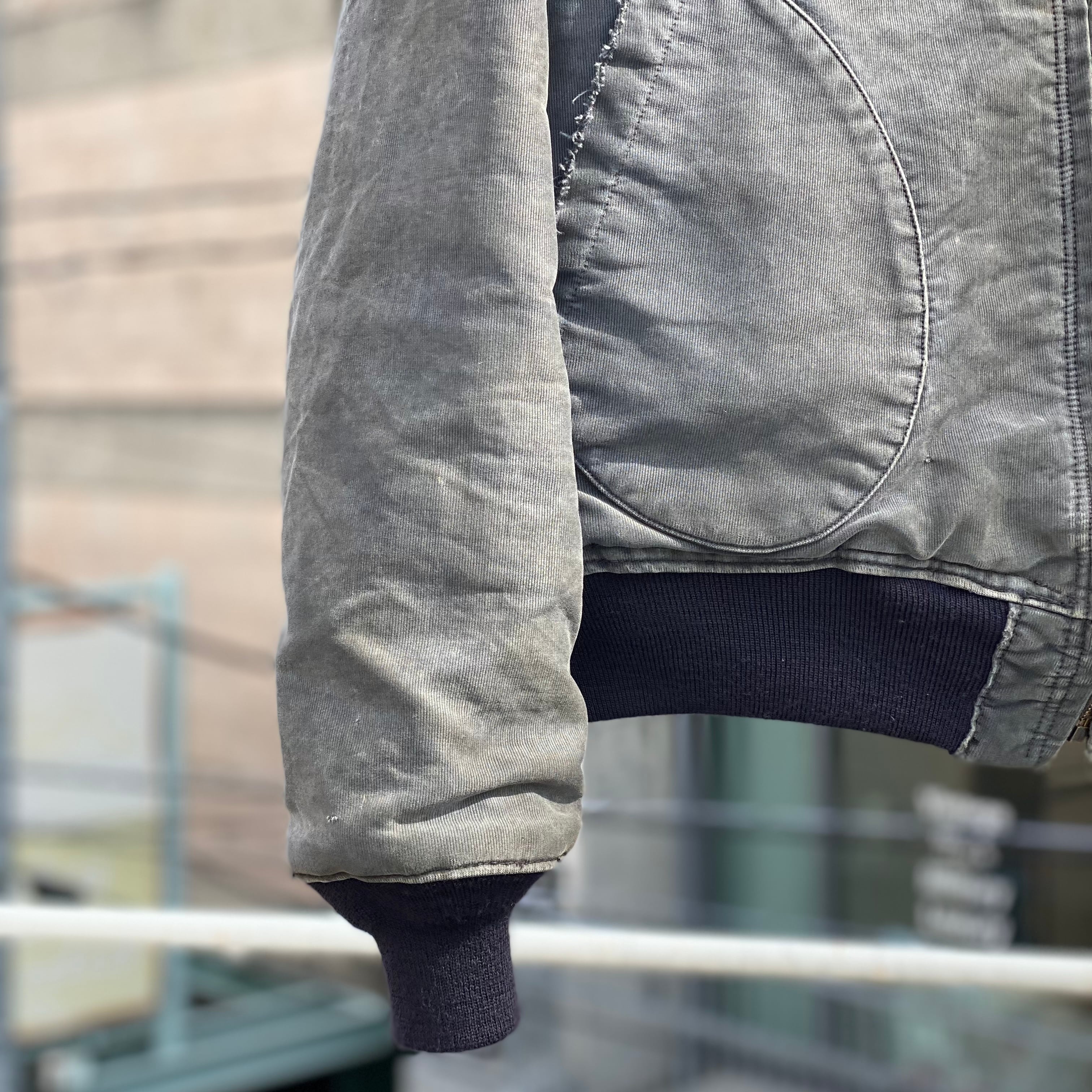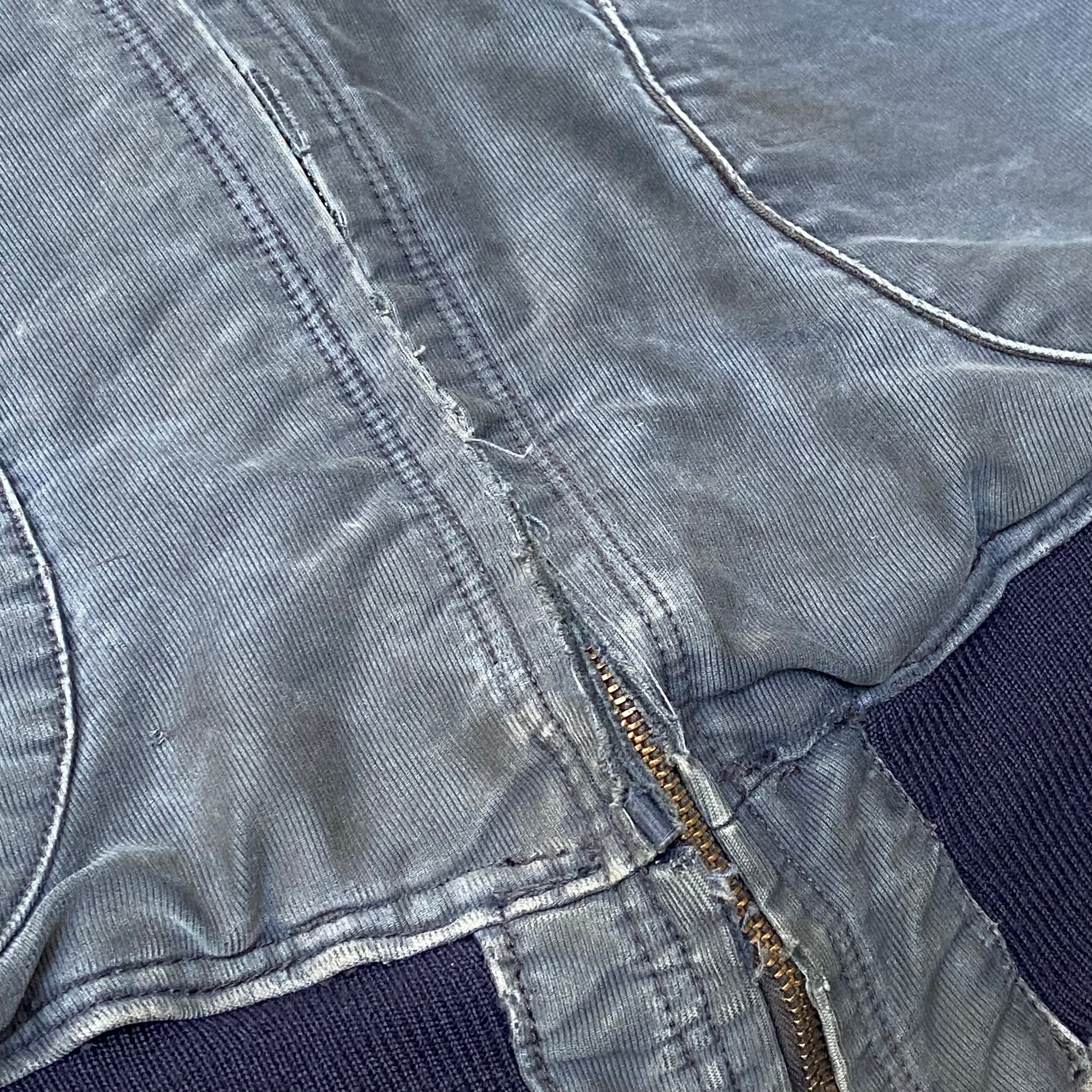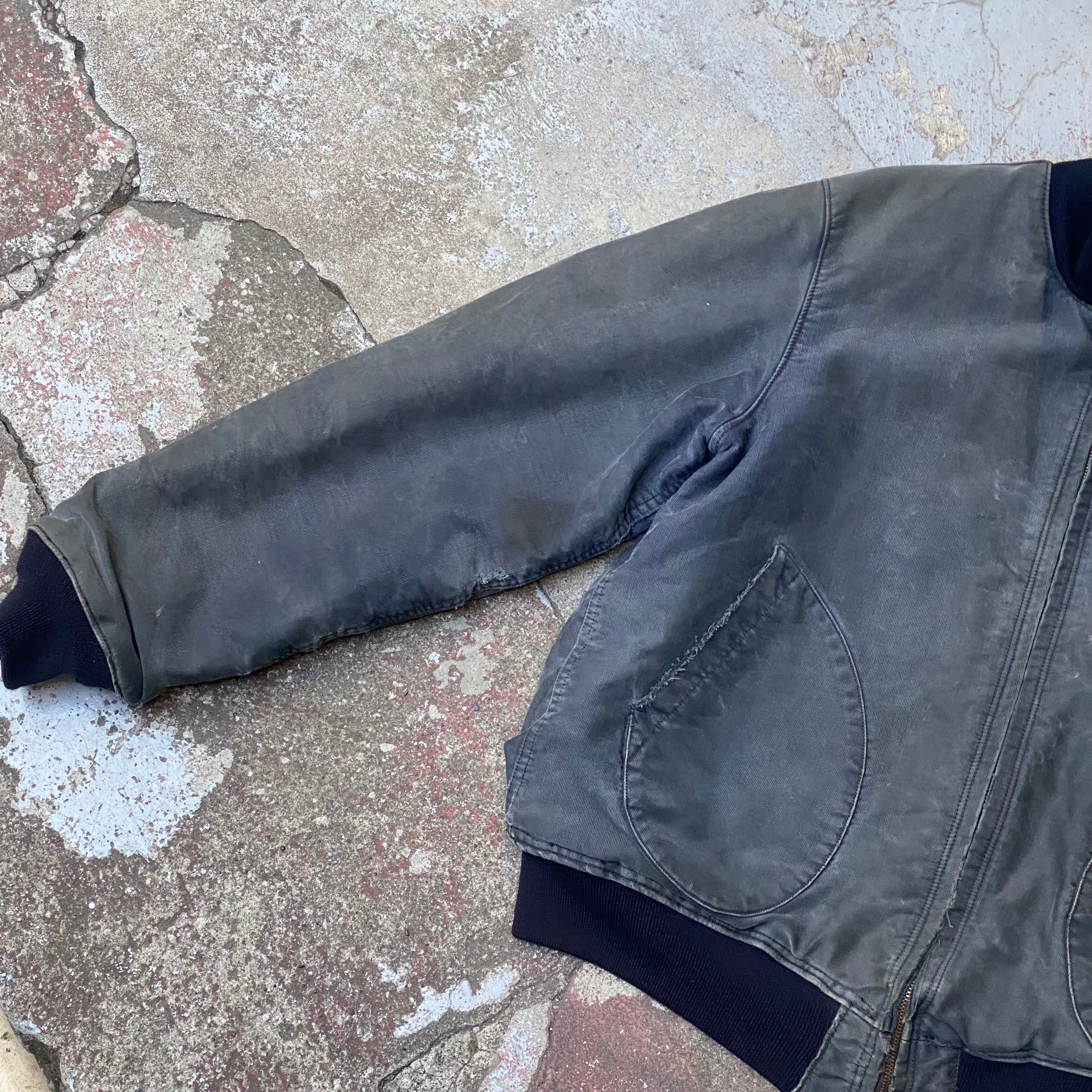 ポケットの入り口にほつれ有り、両袖に小さいダメージ数カ所有り、全体的な使用感有り、裾、袖のリブが交換されてます。タグ欠損。いずれも着用に支障が出るような致命的なものではなく問題なくご着用いただけます。