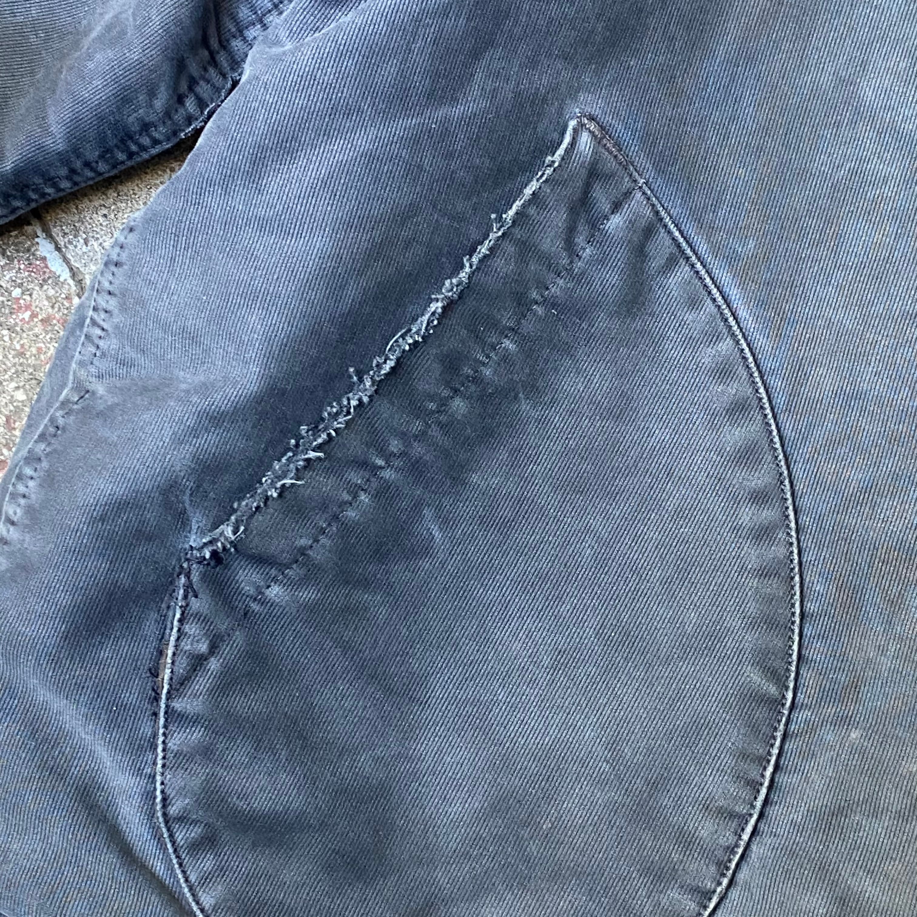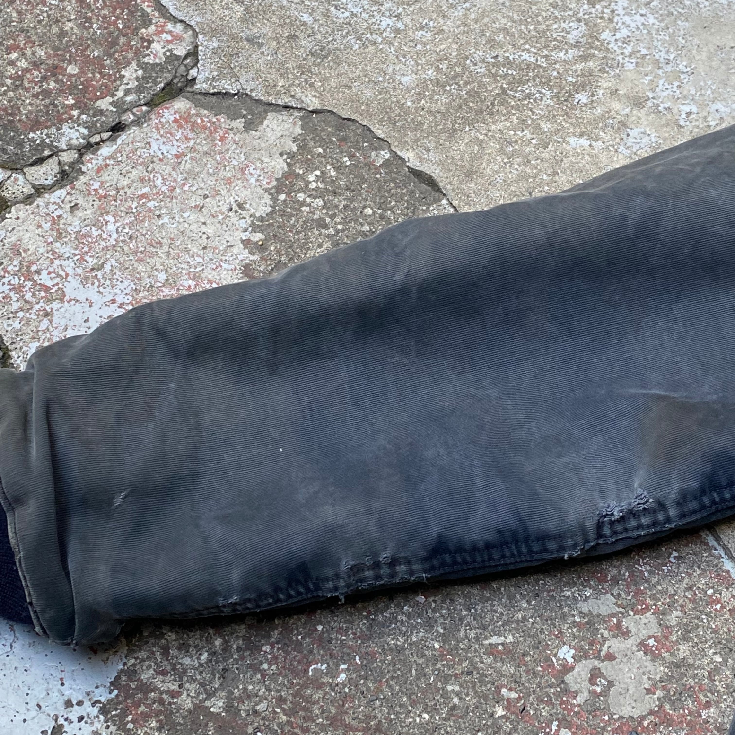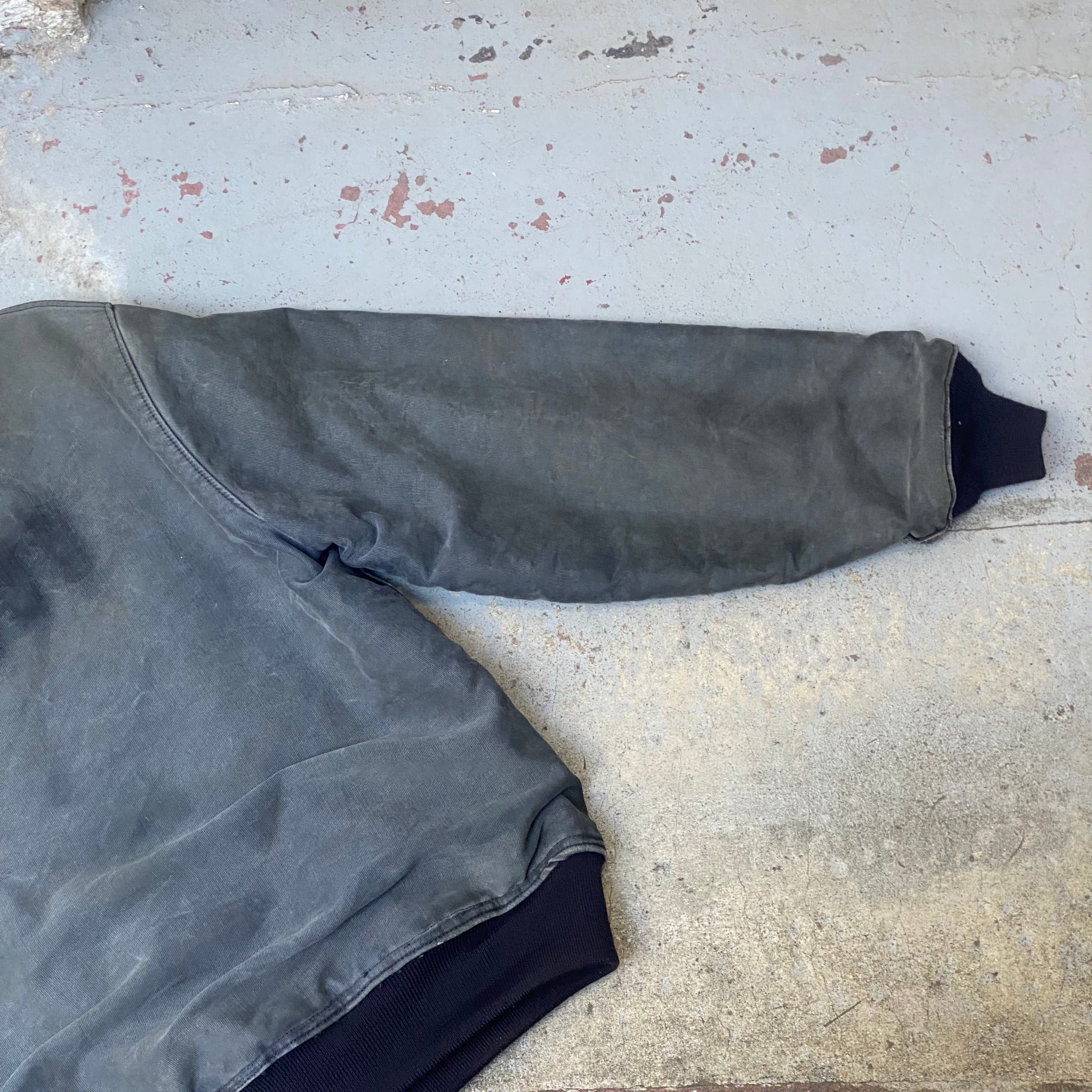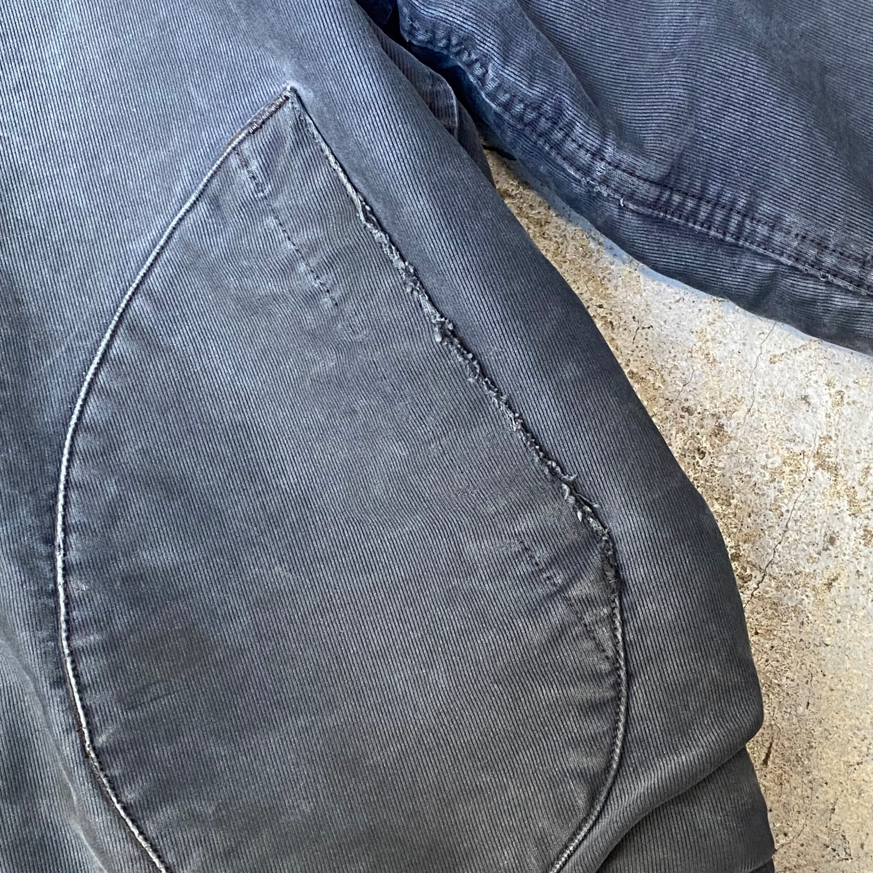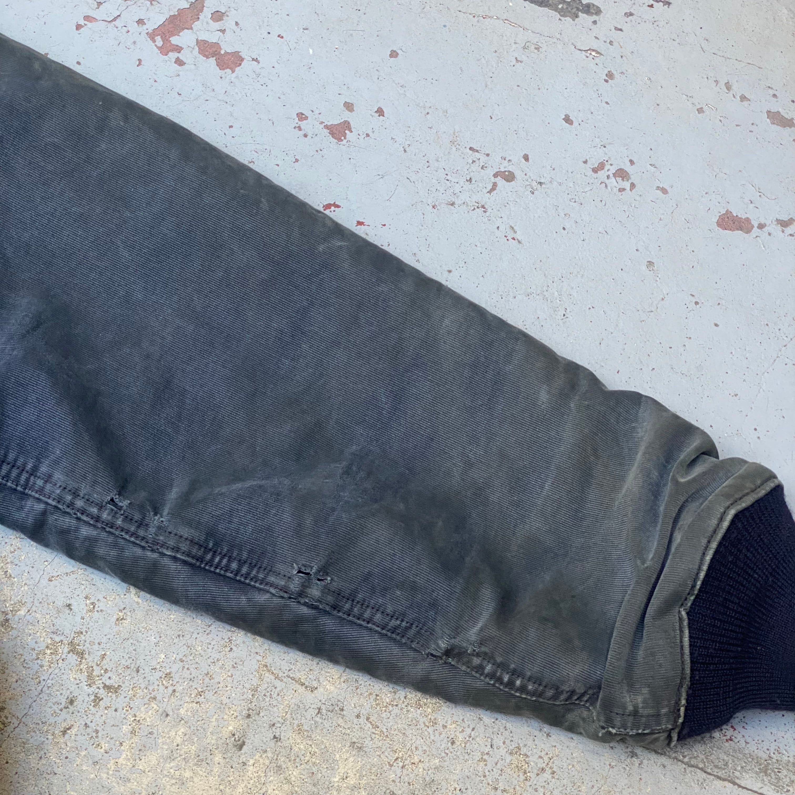 ポケットの入り口にほつれ有り、両袖に小さいダメージ数カ所有り、全体的な使用感有り、裾、袖のリブが交換されてます。タグ欠損。いずれも着用に支障が出るような致命的なものではなく問題なくご着用いただけます。