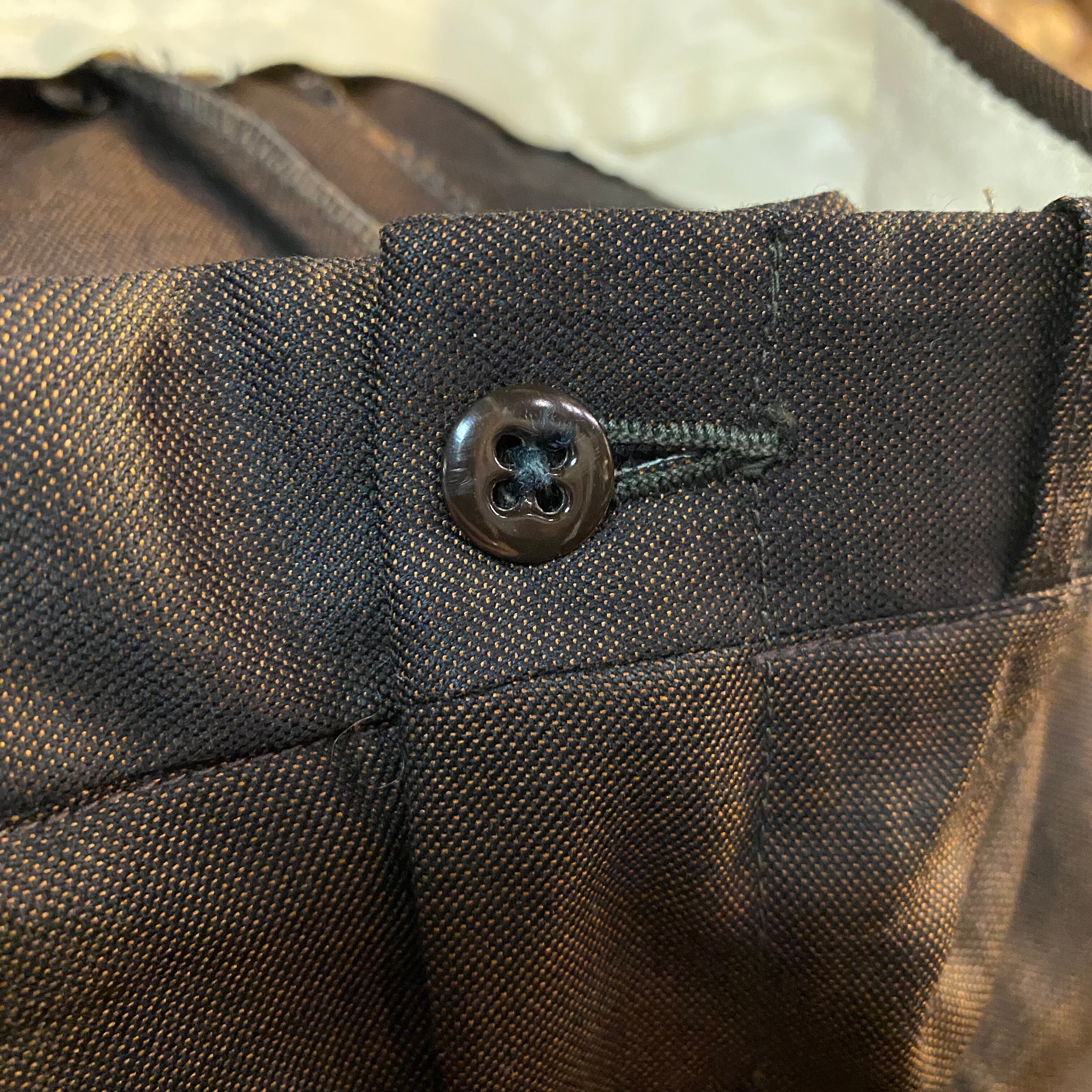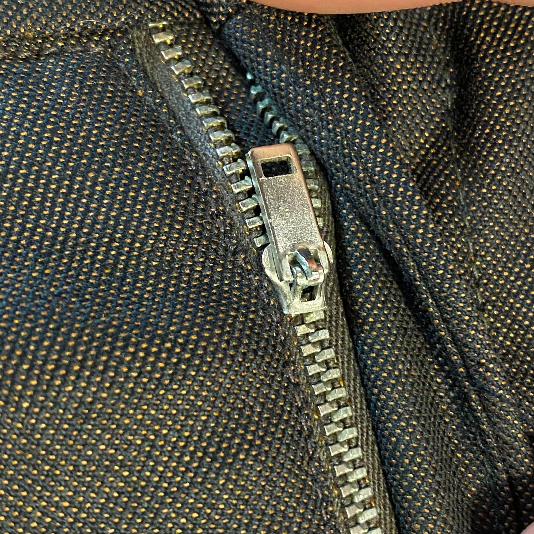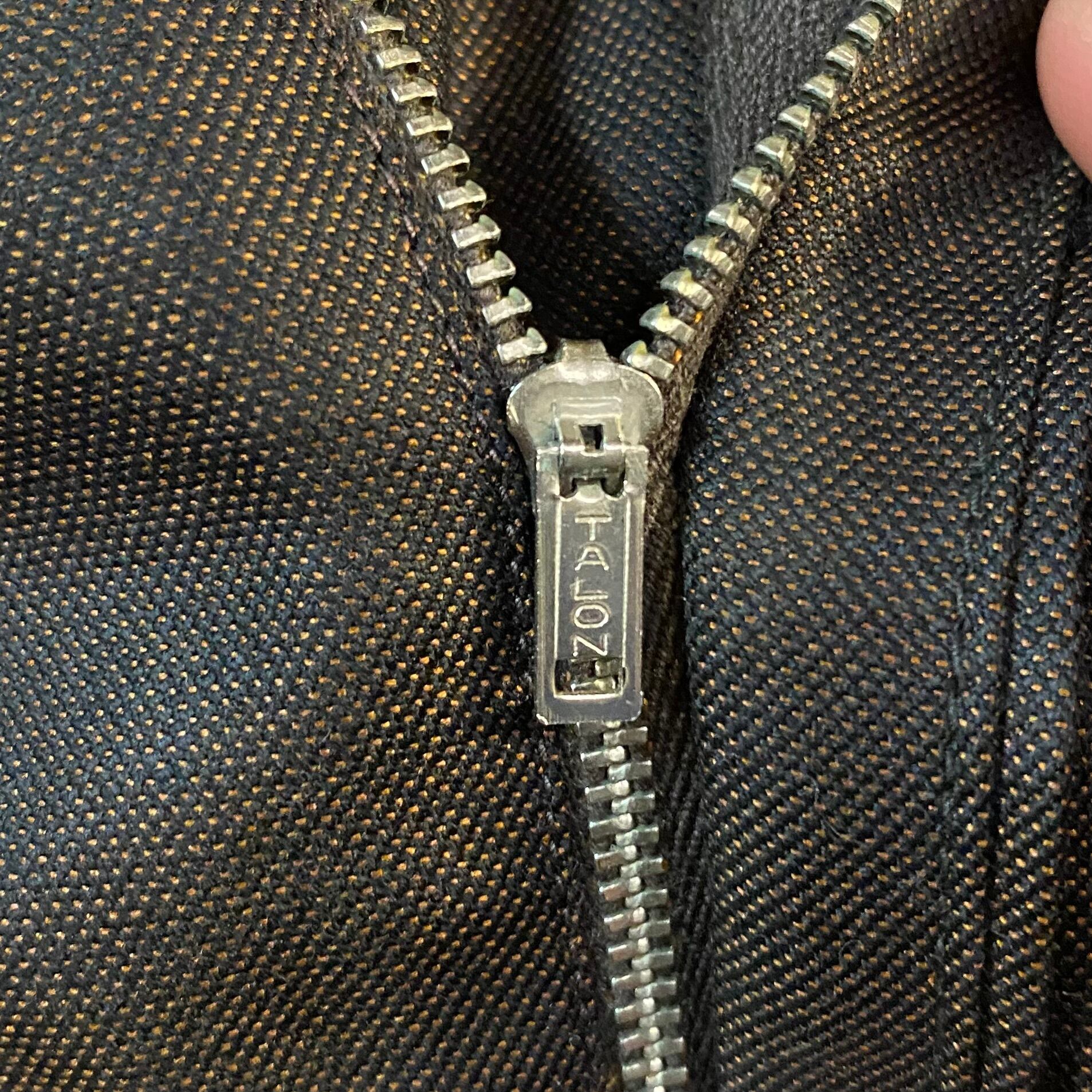 タロンジッパーの玉虫色スラックス。