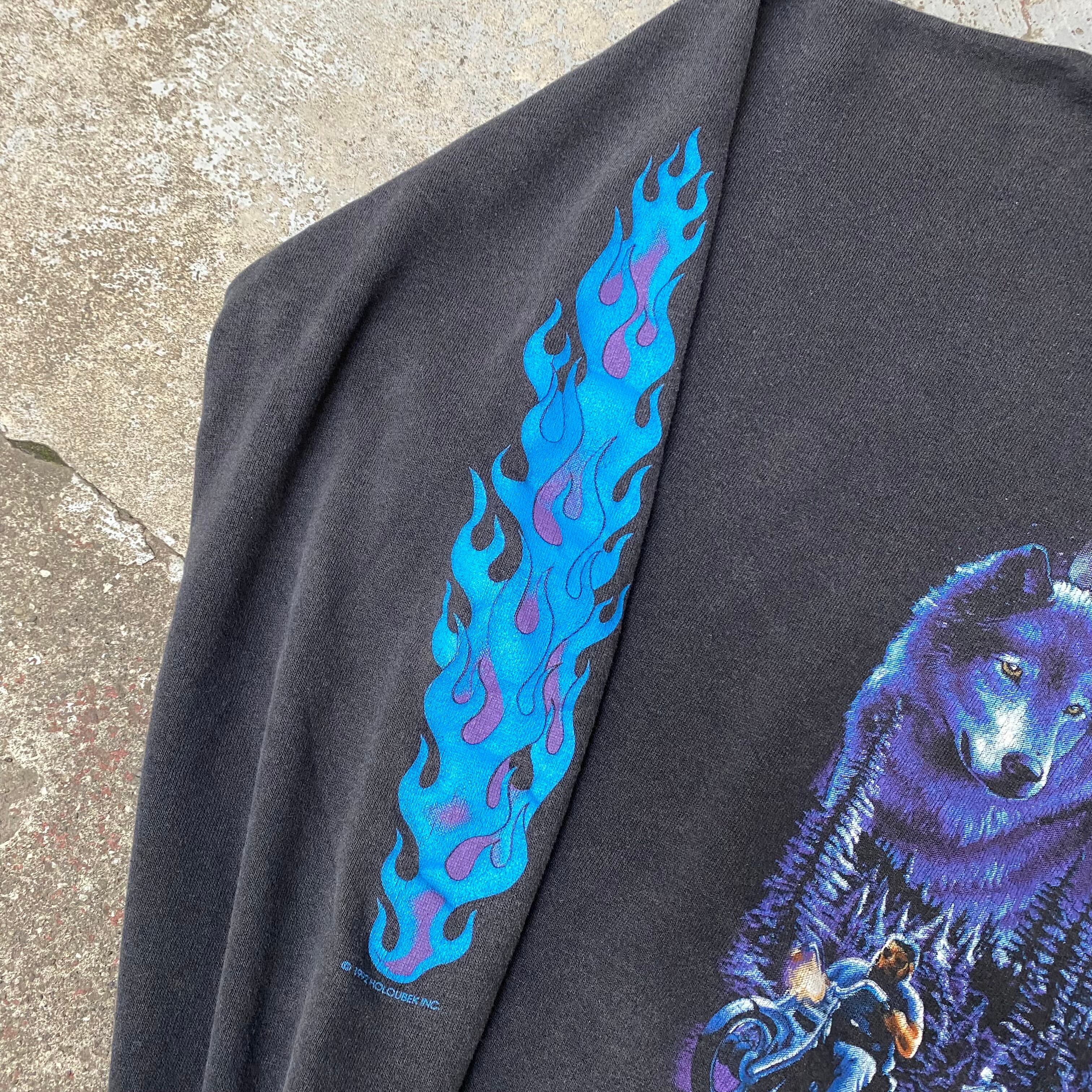 正面のプリントはTシャツでも見かける狼のプリントですが、嬉しいことに長袖なので袖にもフレイムがプリントされています。