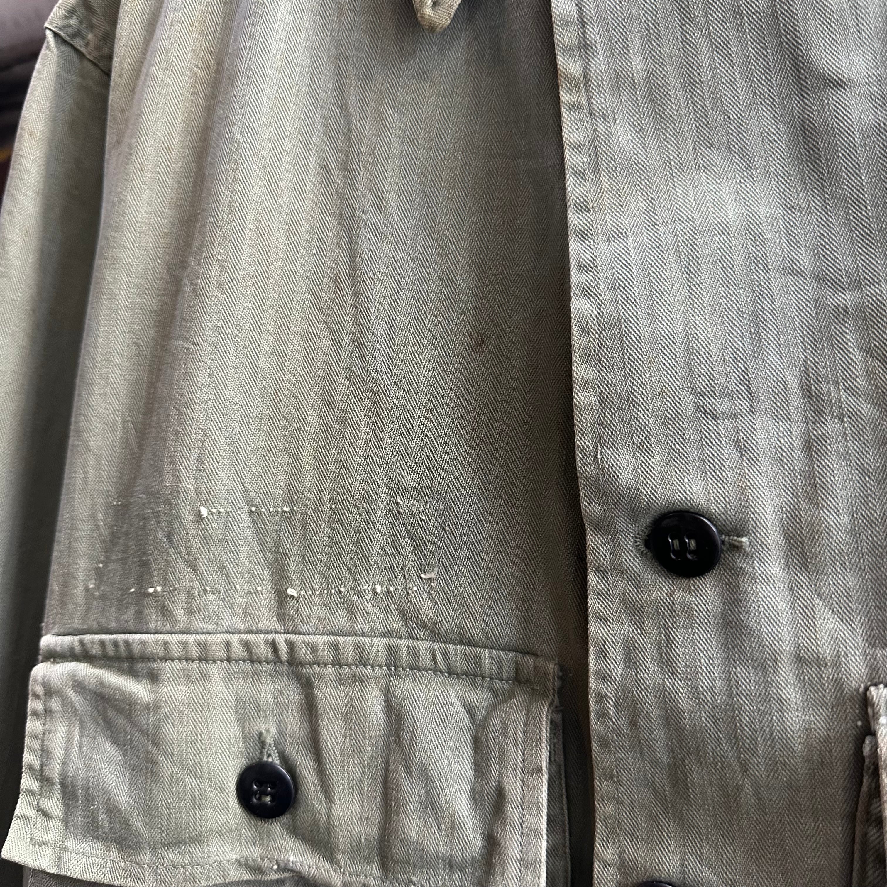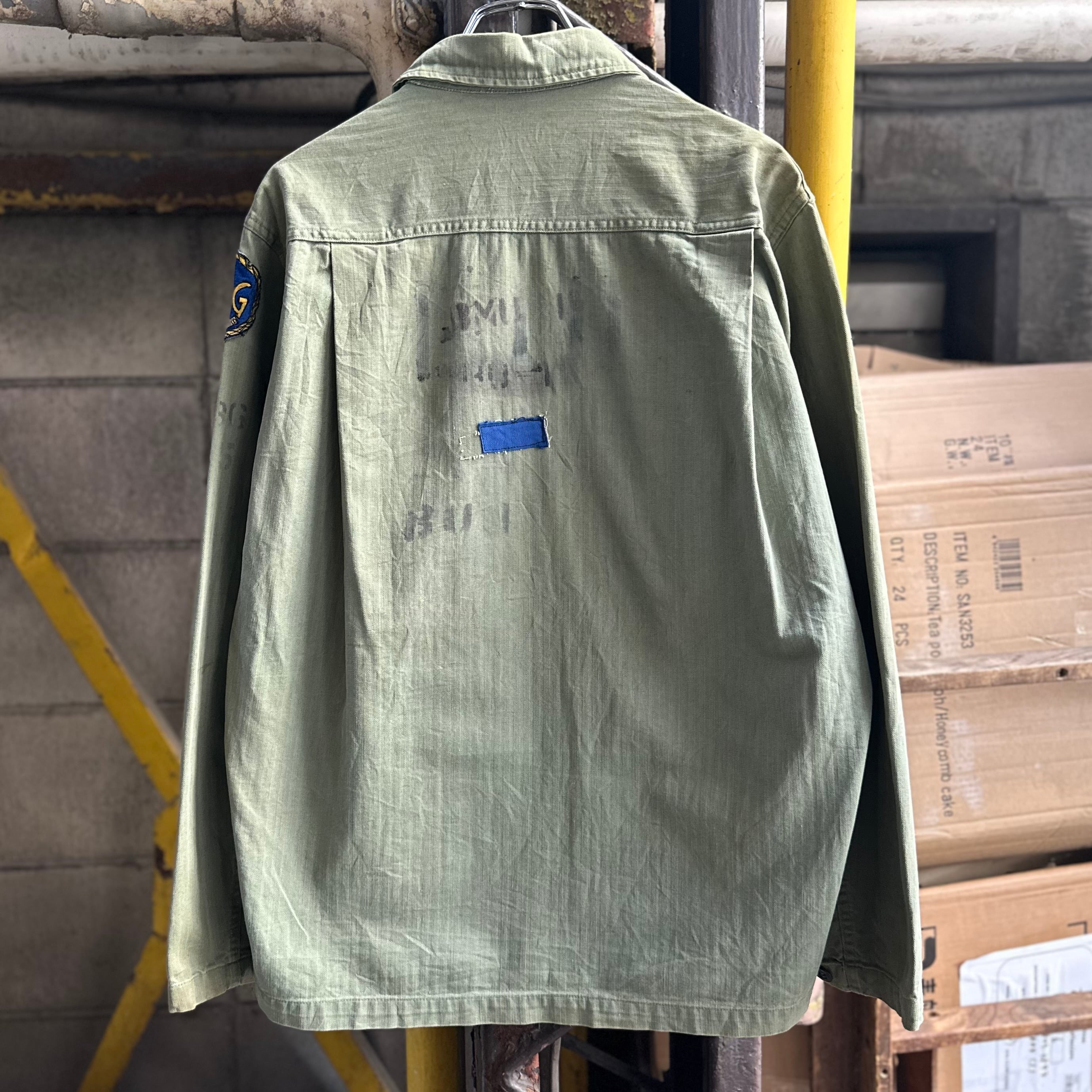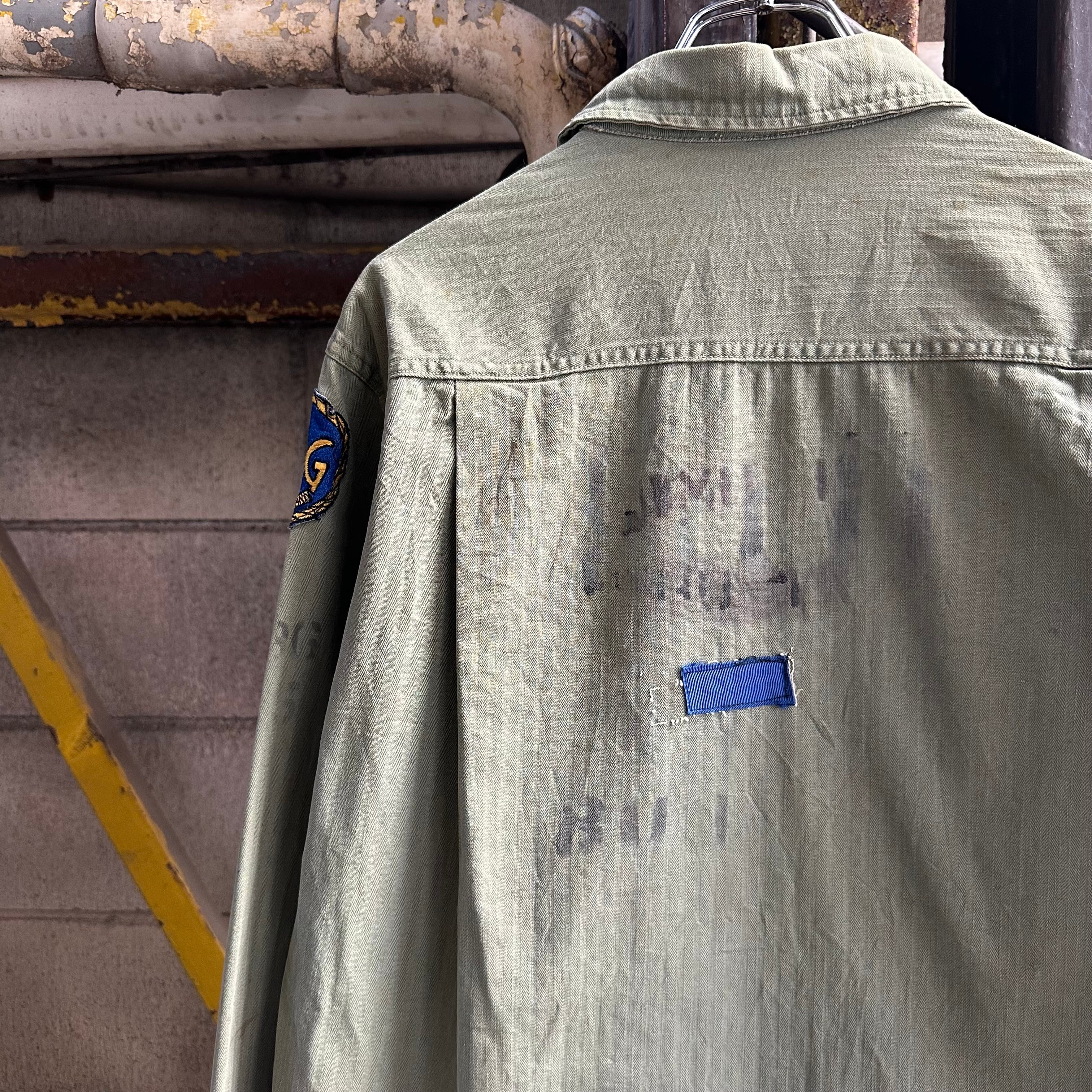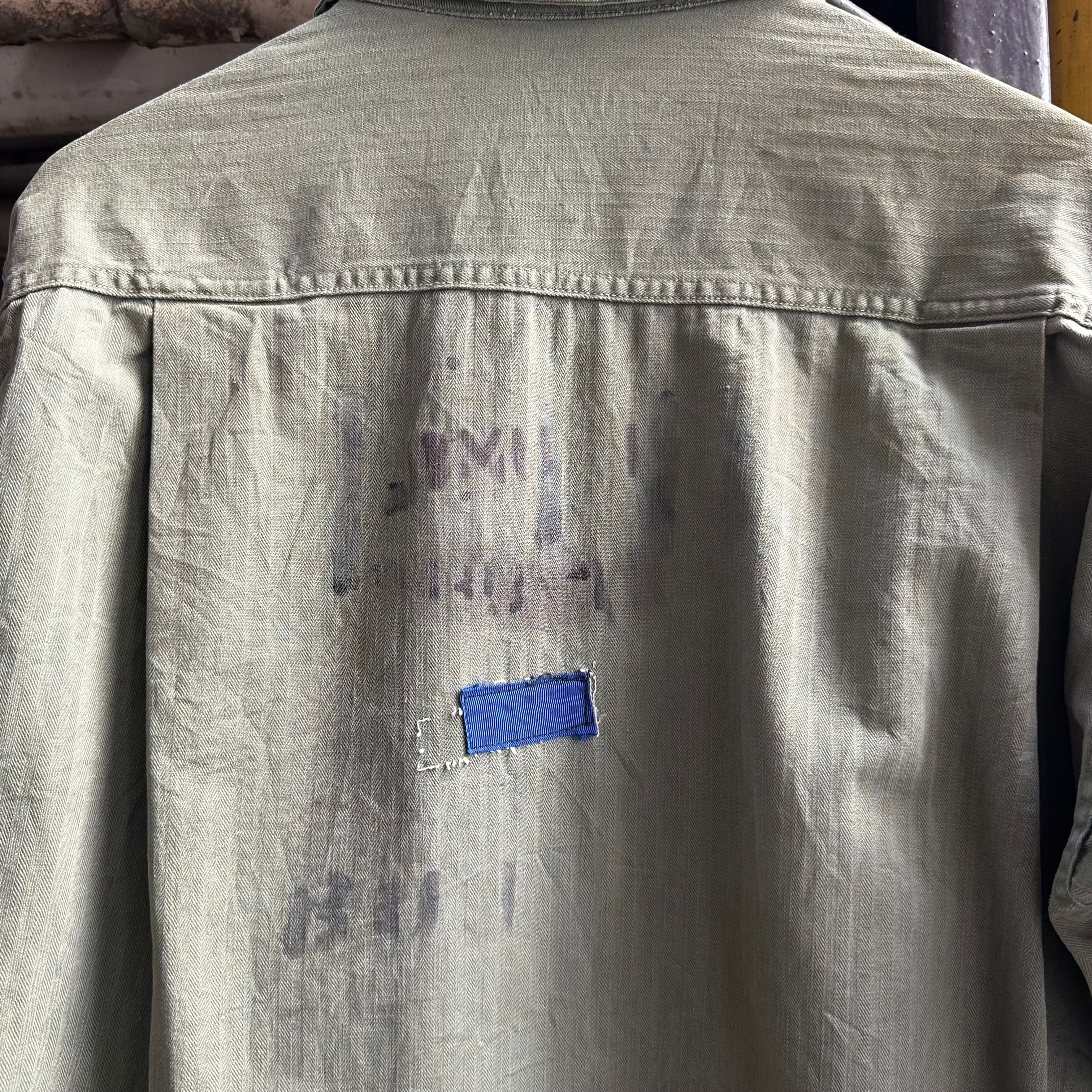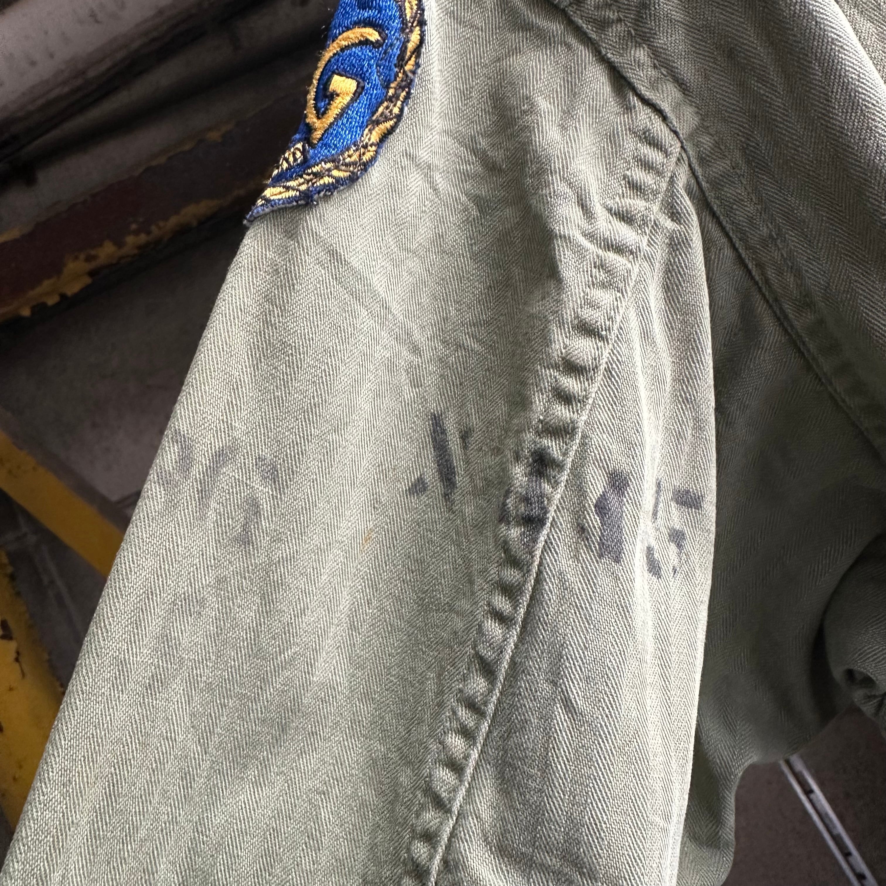 月桂樹ボタンタイプではなく、黒尿素ボタン仕様で珍しい1着、さらにステンシル、ワッペンが入り他の個体とは異なる雰囲気での着用も可能です‼︎