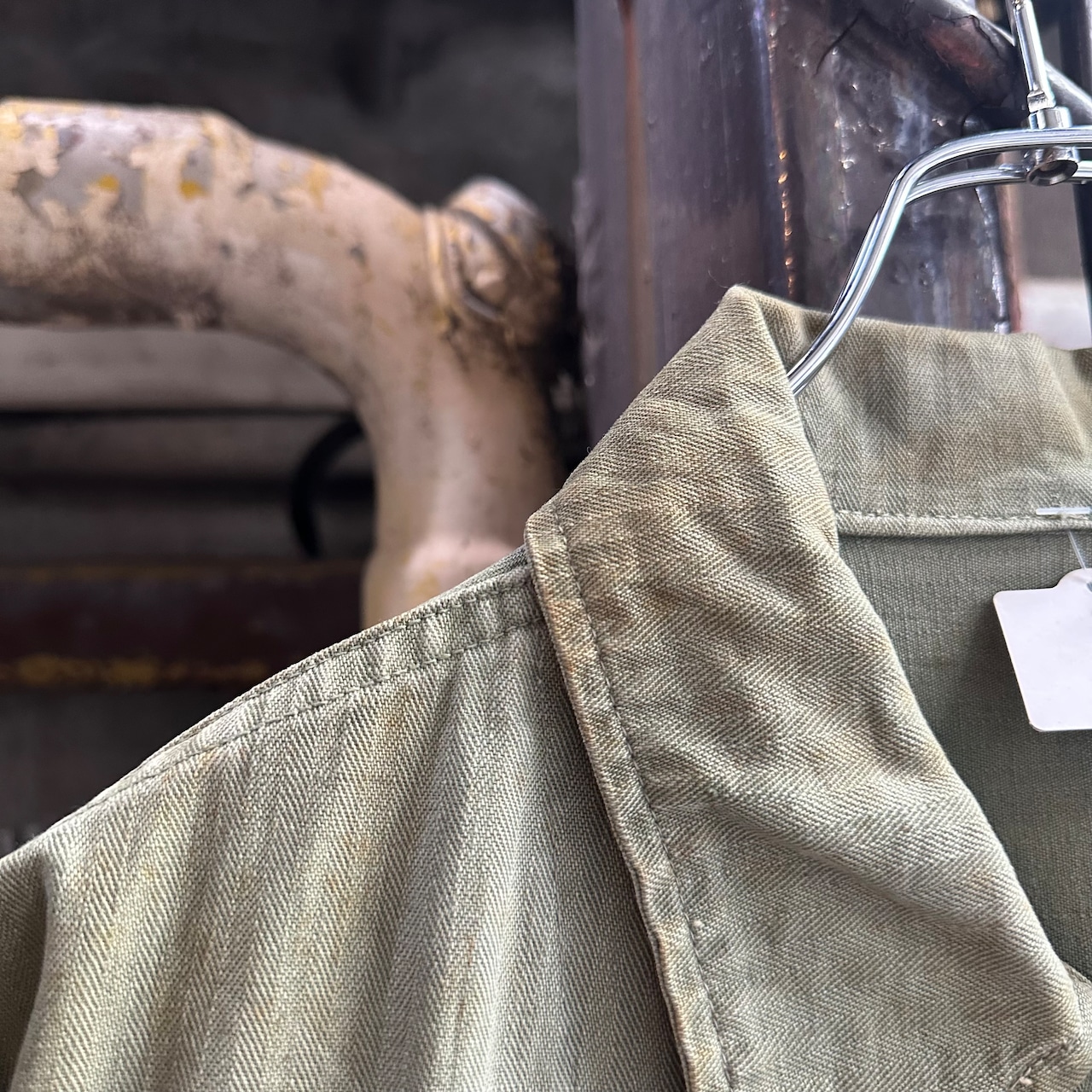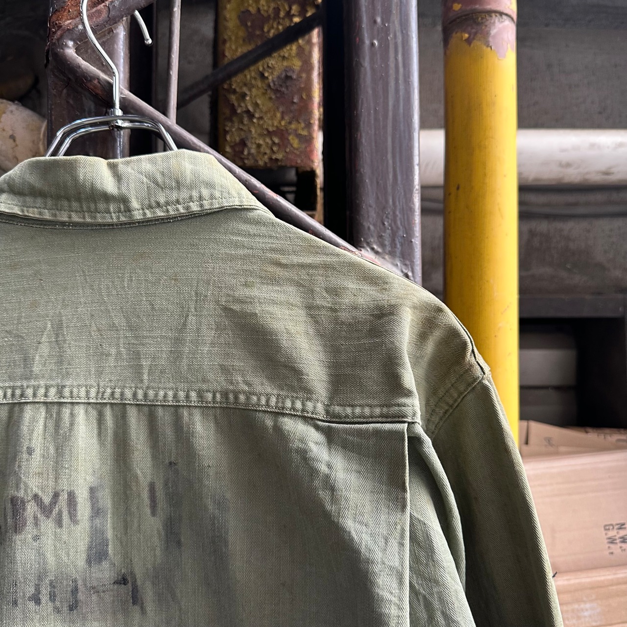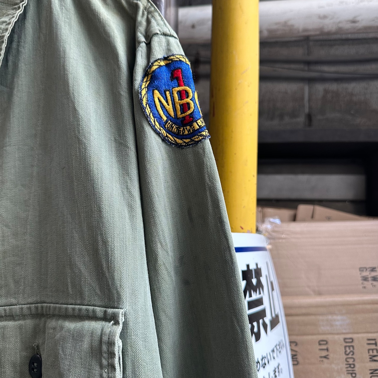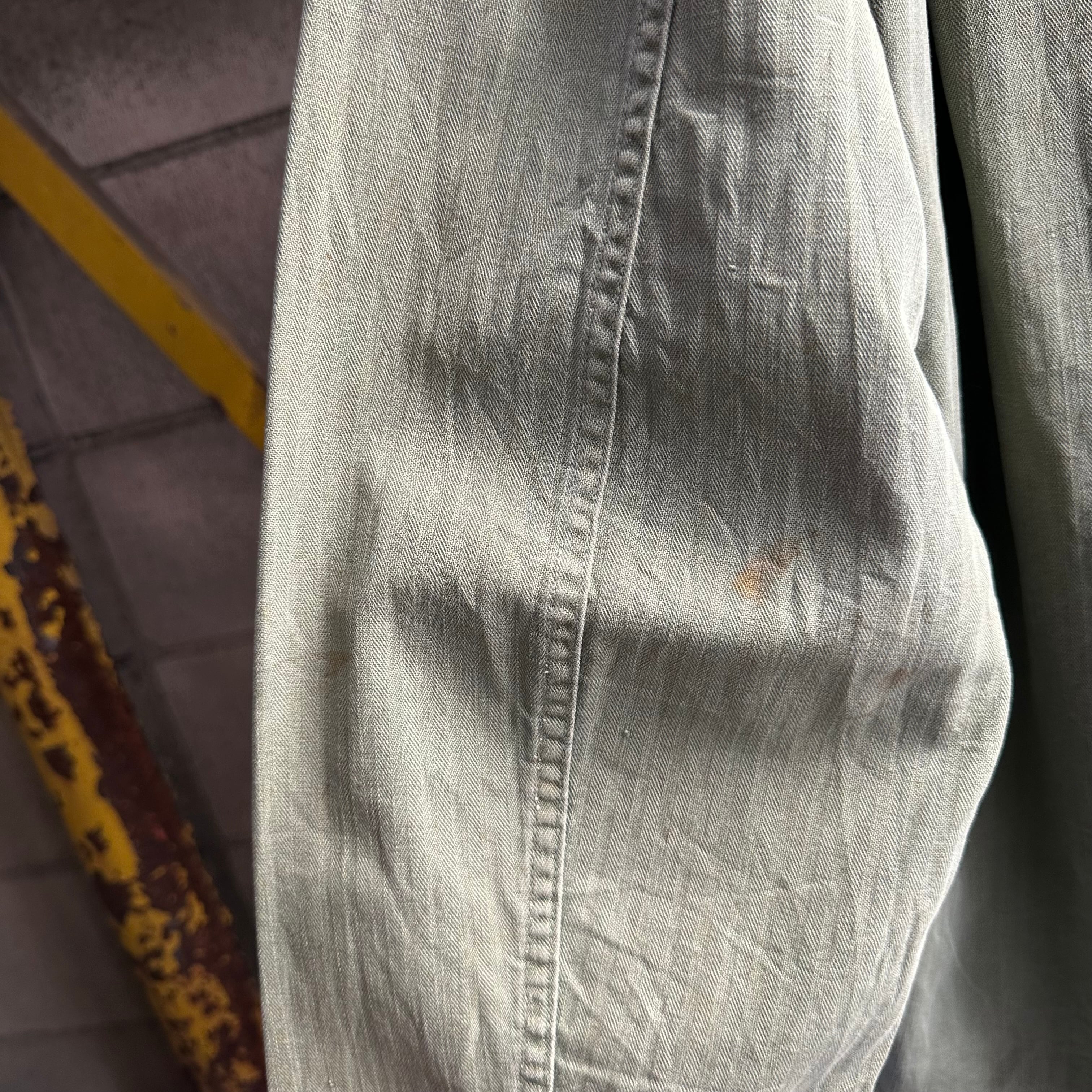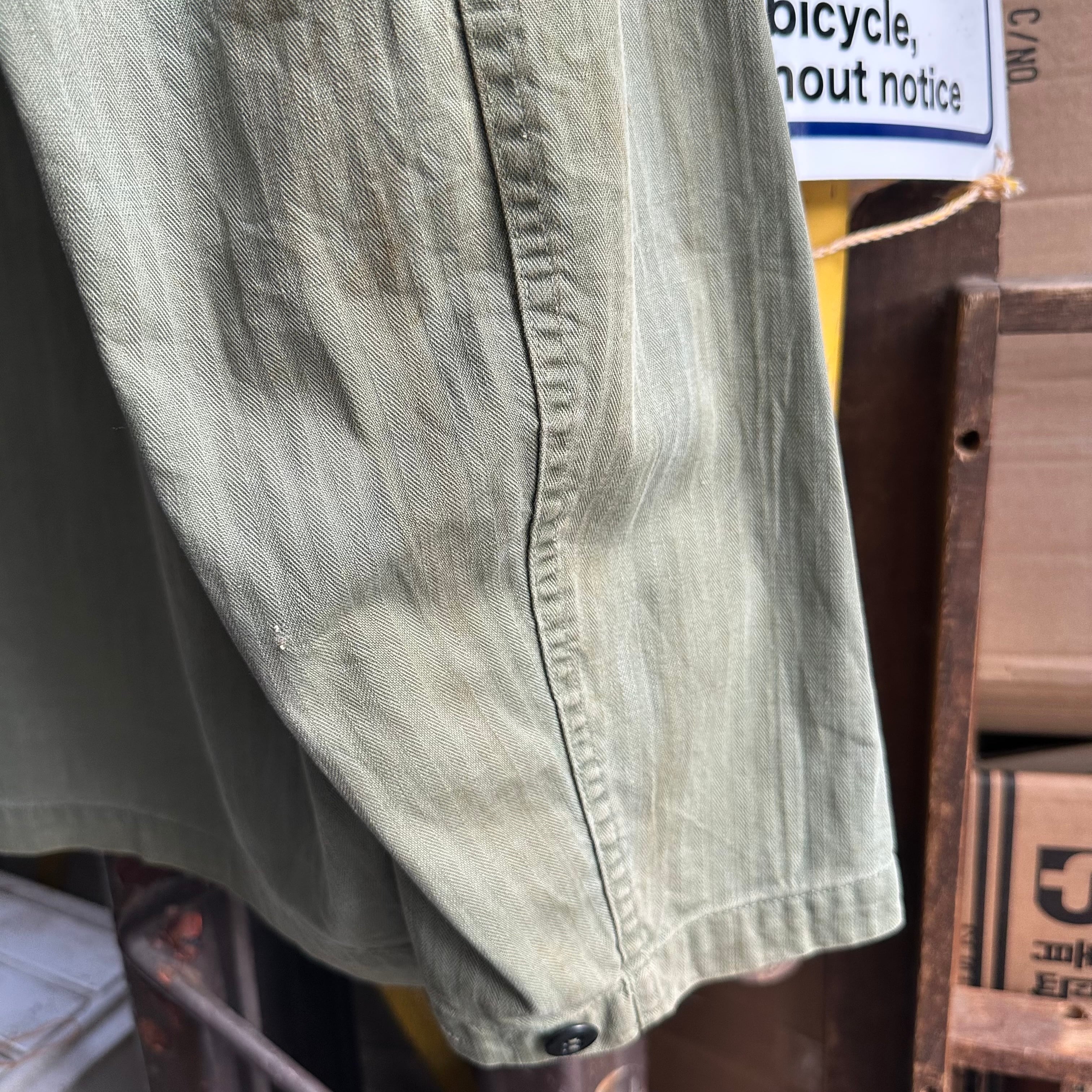 月桂樹ボタンタイプではなく、黒尿素ボタン仕様で珍しい1着、さらにステンシル、ワッペンが入り他の個体とは異なる雰囲気での着用も可能です‼︎