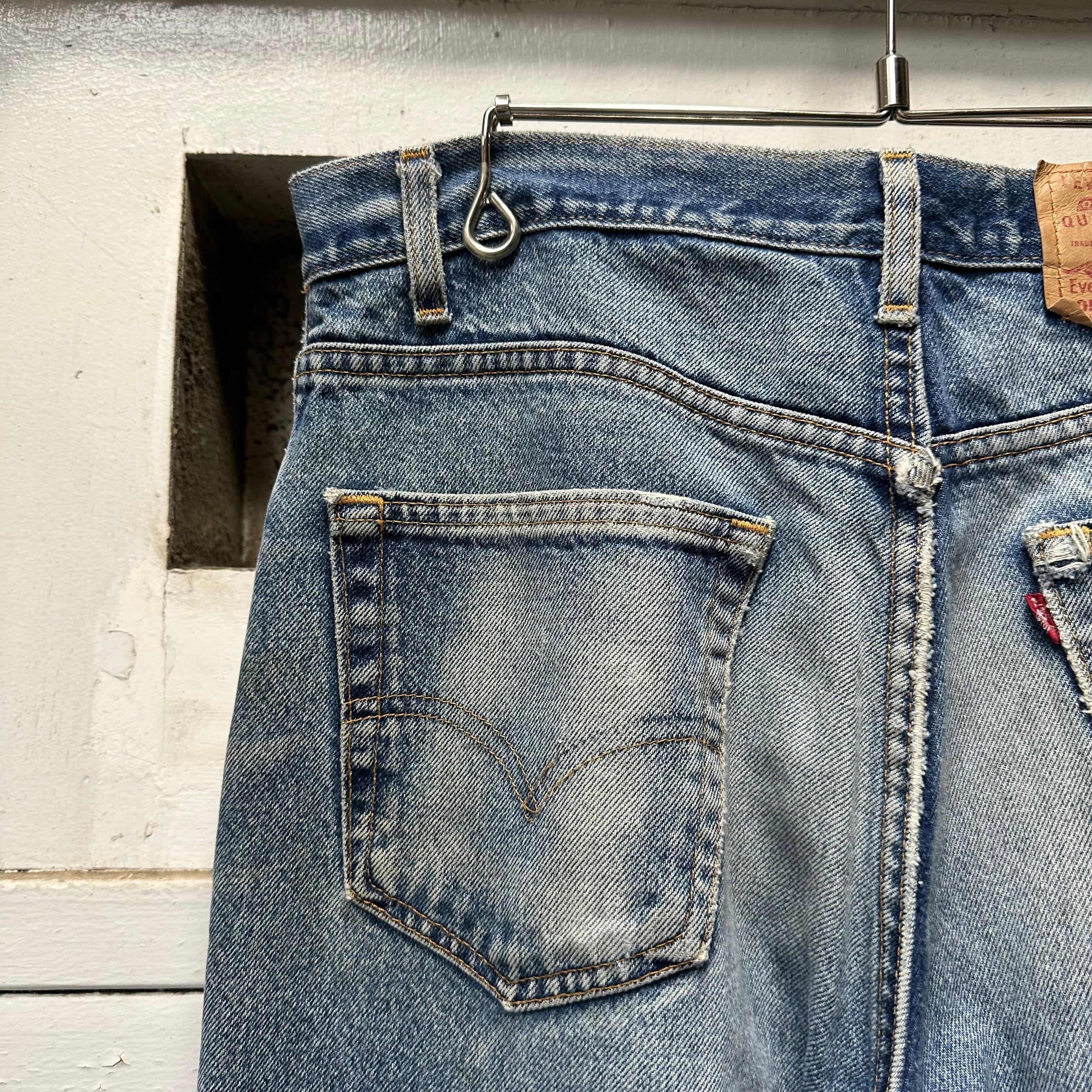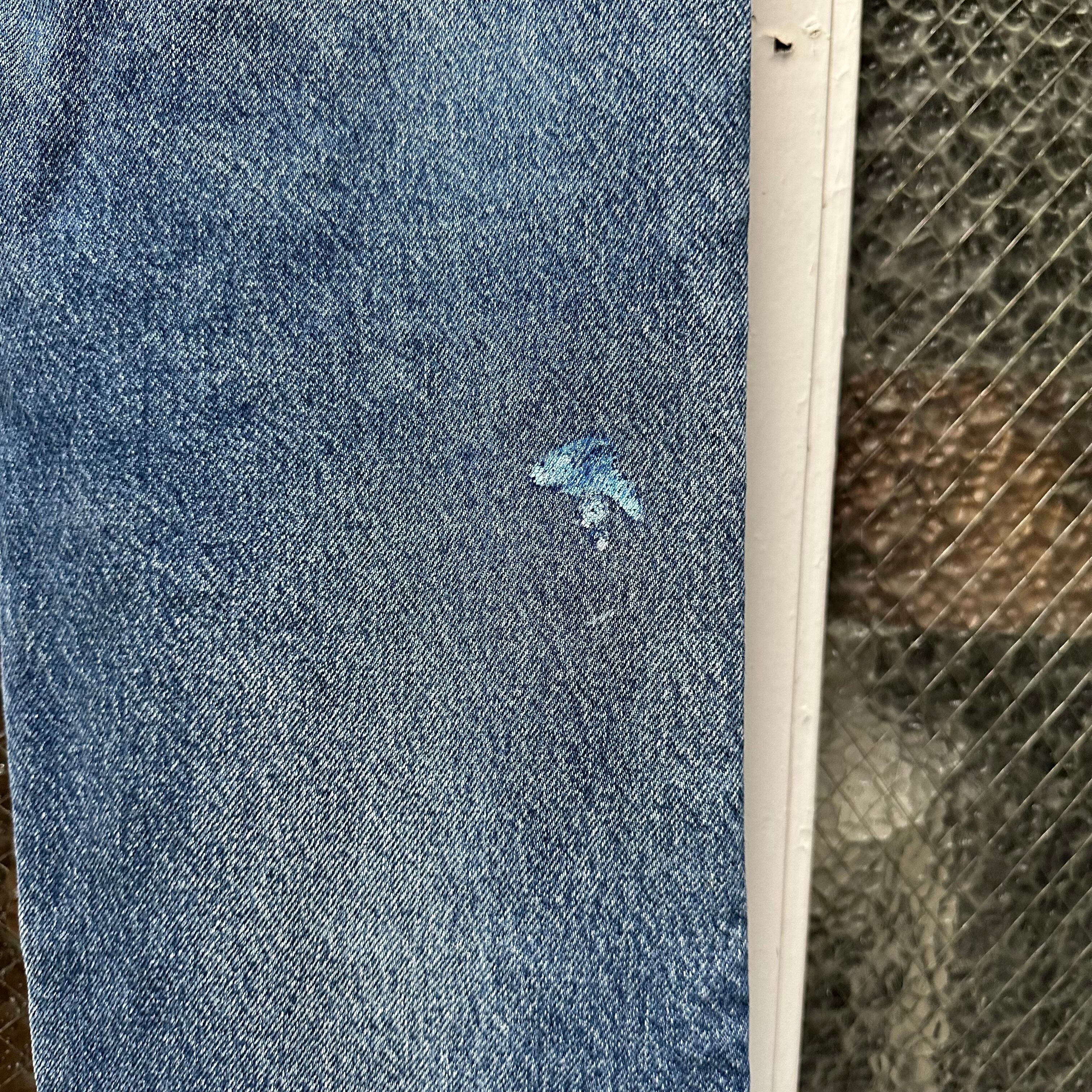 右膝裏ペンキ有り。バックポケット付近、裾ほつれあり。