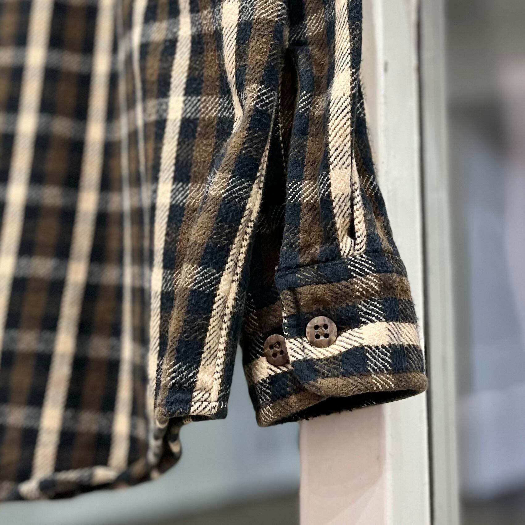 全体のトーンも明るすぎないため、クールな印象を受けるネルシャツです