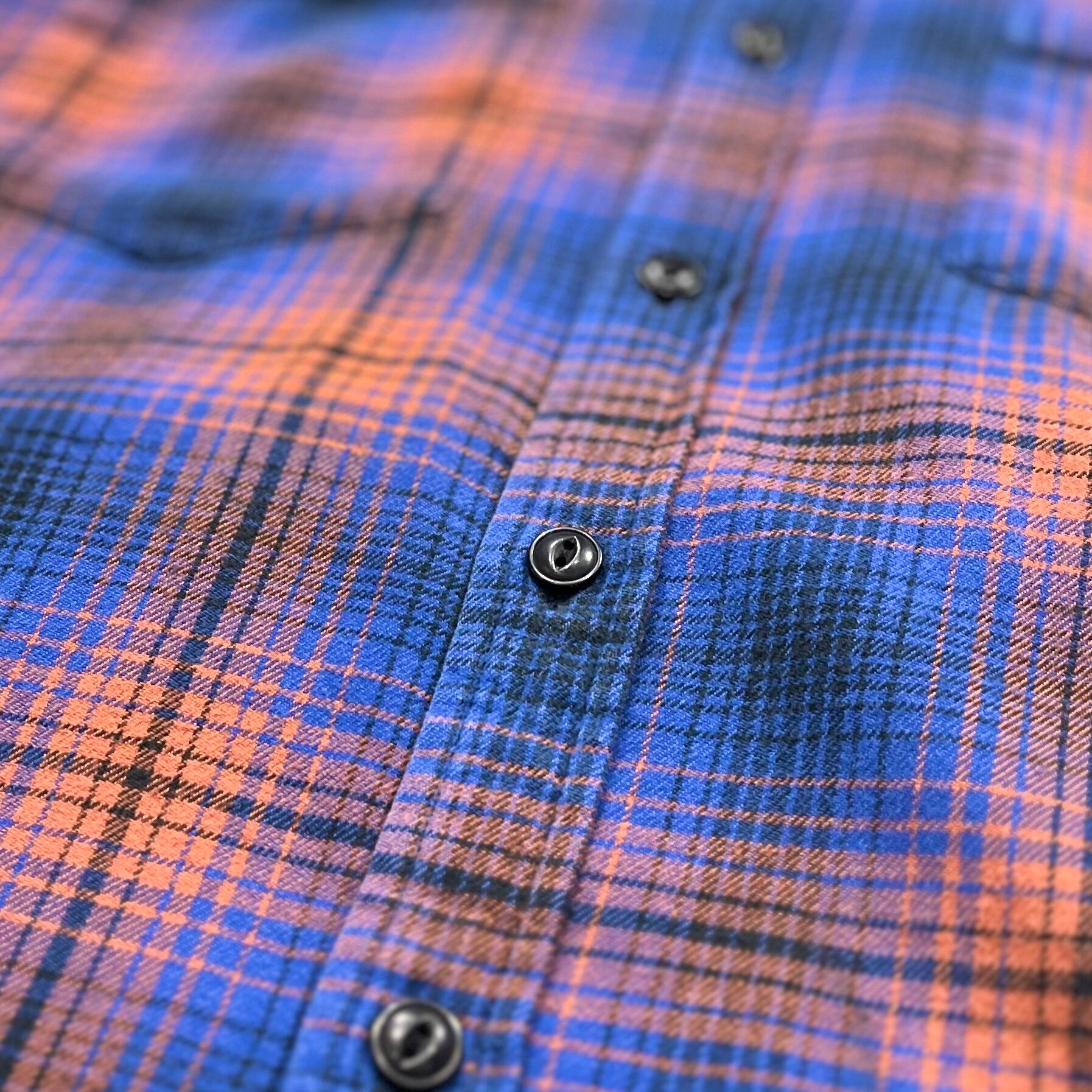 なんとも珍しいオレンジ×青のオンブレチェックパターンが目を惹くこちらの一着