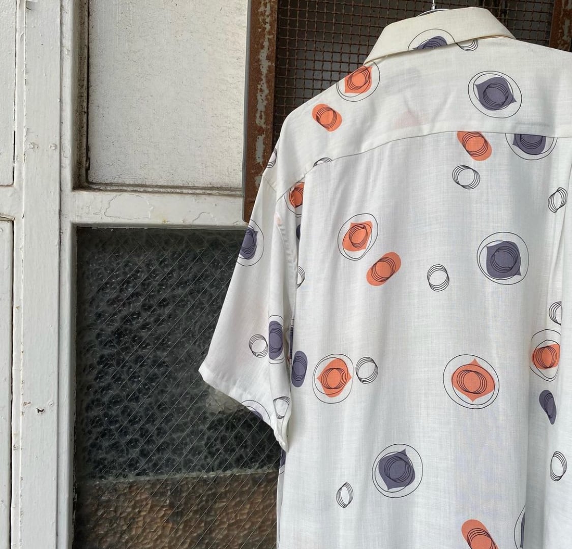 アトミック柄、トップボタンはループの開襟シャツでDead Stockになります。