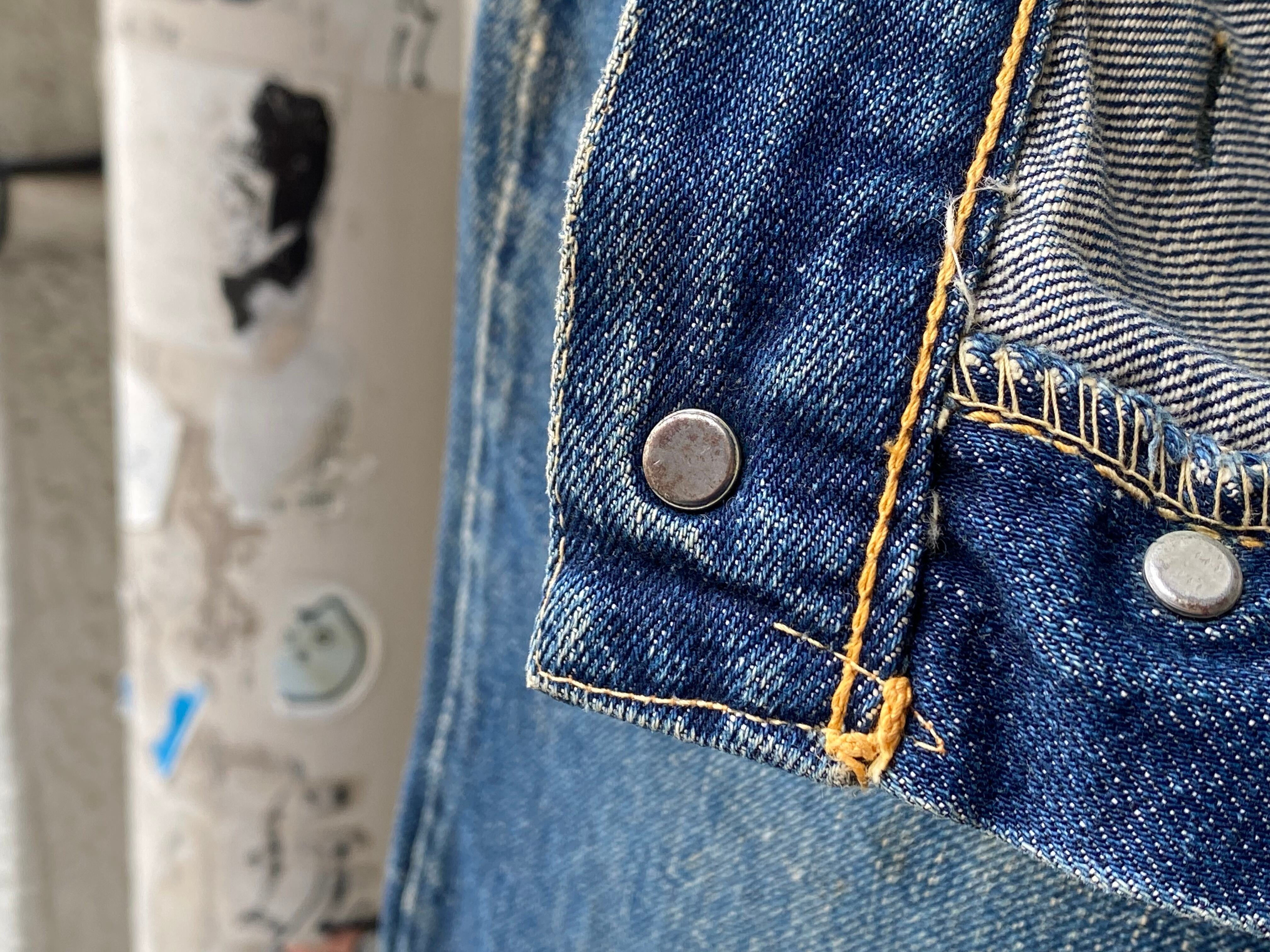 ポケット部分の僅かな擦れ、ペンキ飛び、裾上げ、裾部分のロールアップ跡と擦れ、左脛付近に糸抜け、右腿後ろに糸抜けが有ります。