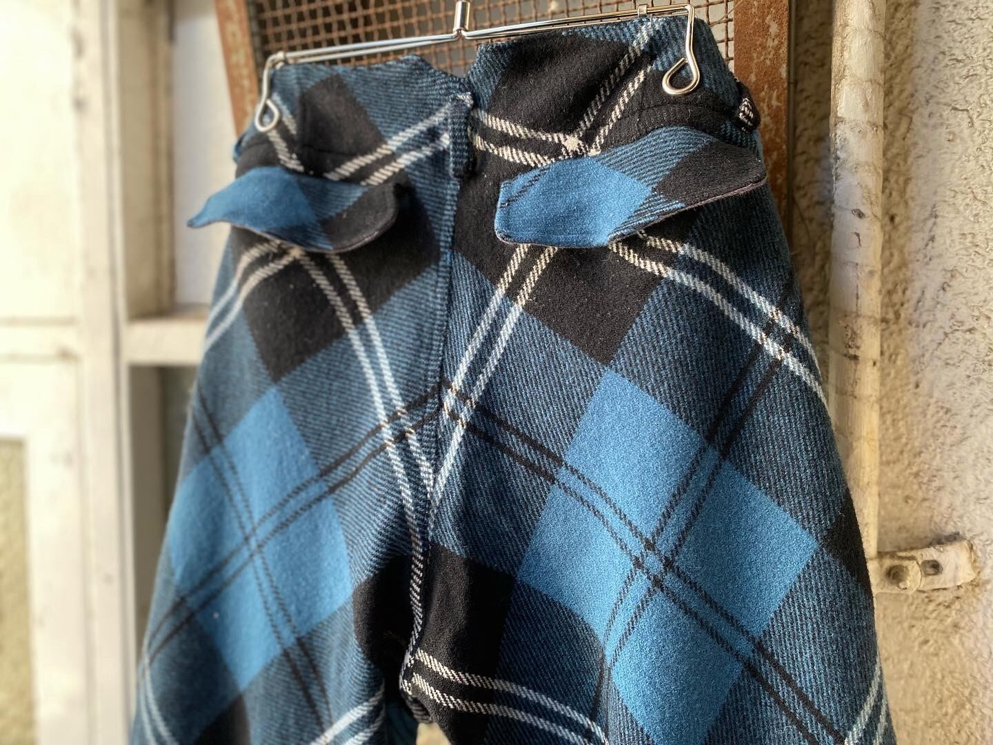 ブルーに白黒のチェックのパンツ。