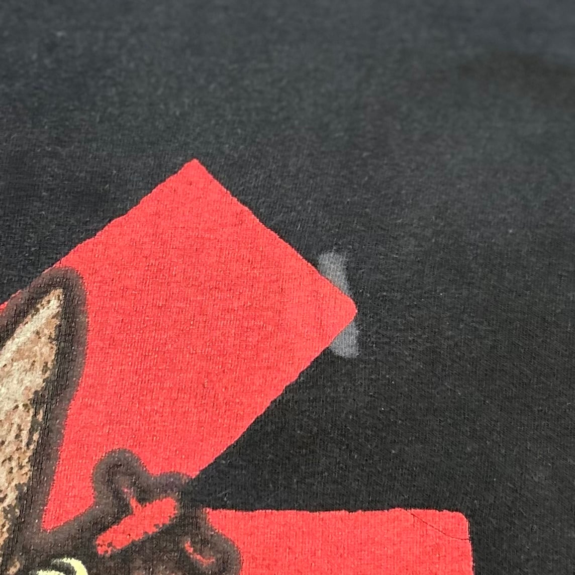 フロントロゴ付近にシミ、バックプリント付近にシミ、左袖に小指の爪程の破れがございます。
