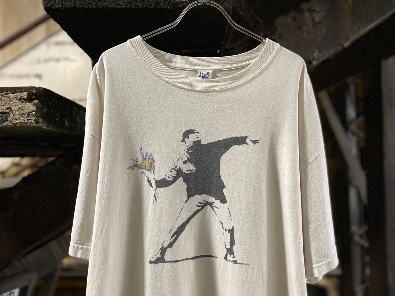 作品をストリートなどの公共空間に描き、その時どきの大きな社会問題の現場に作品を残したり紛争についてのステンシル作品を発表してる世界で最も有名なストリートアーティスト"バンクシー"のTシャツになります。