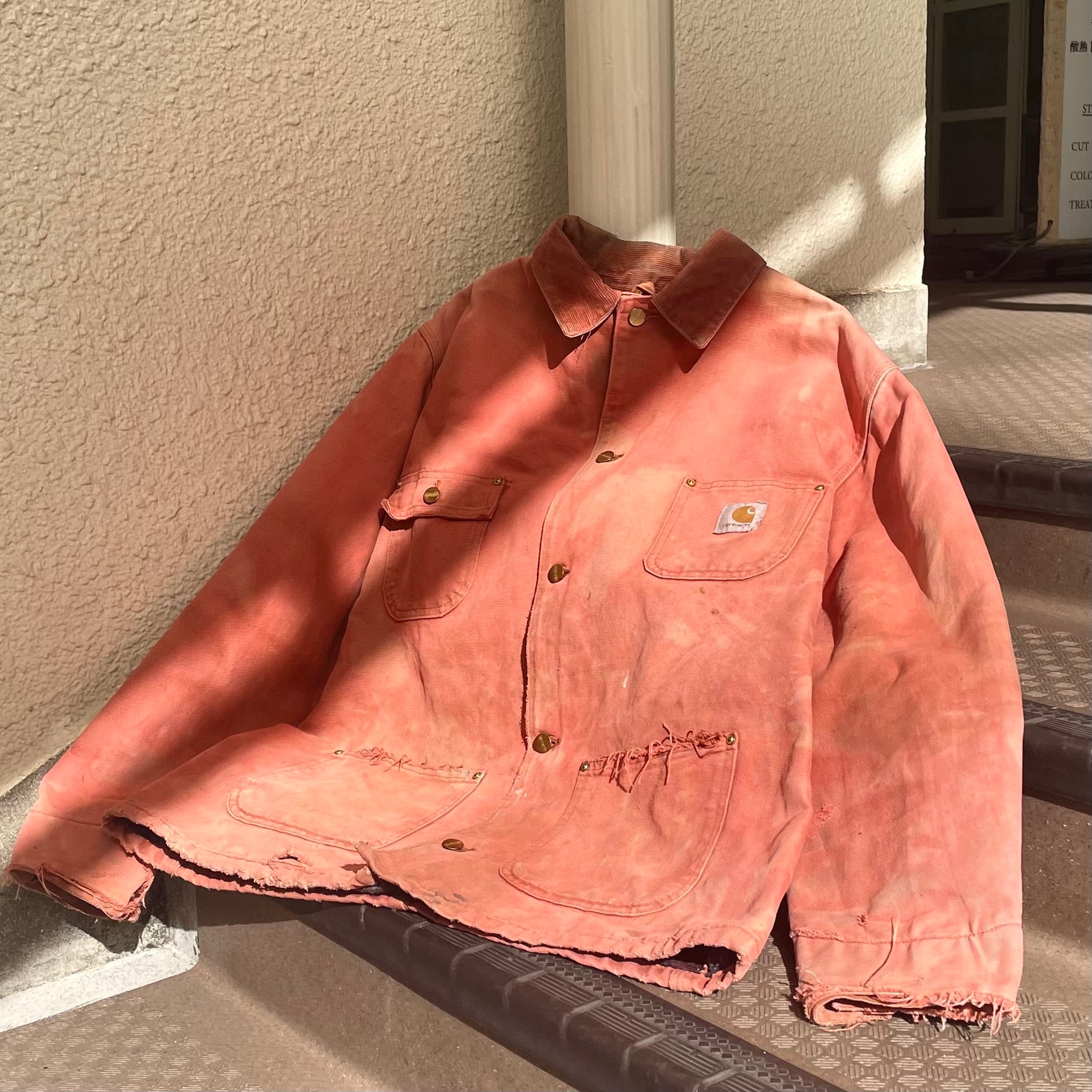 カーハートの中でも特段アダルティ且つ堅い印象のチョアコートですが、こちらは後染めでコーラルピンクに染められている特殊個体
